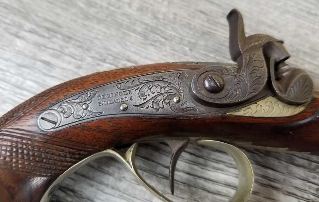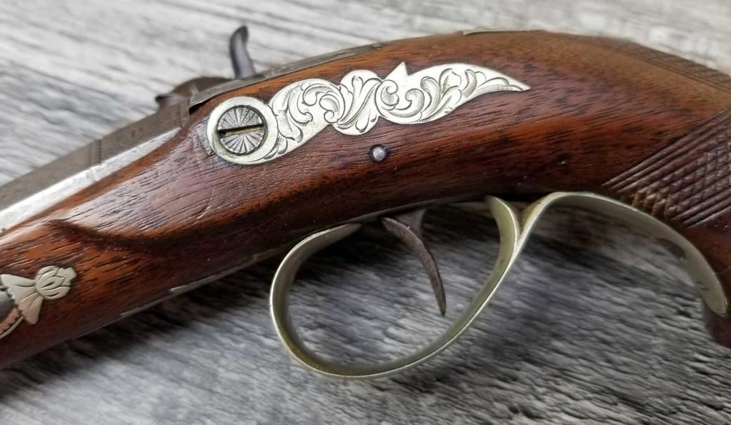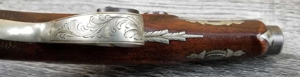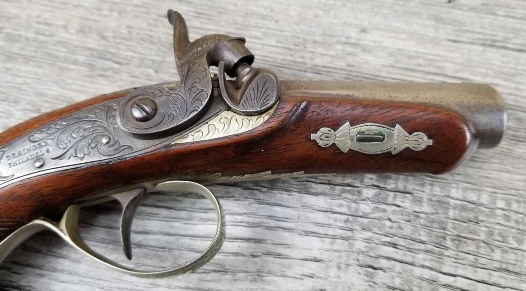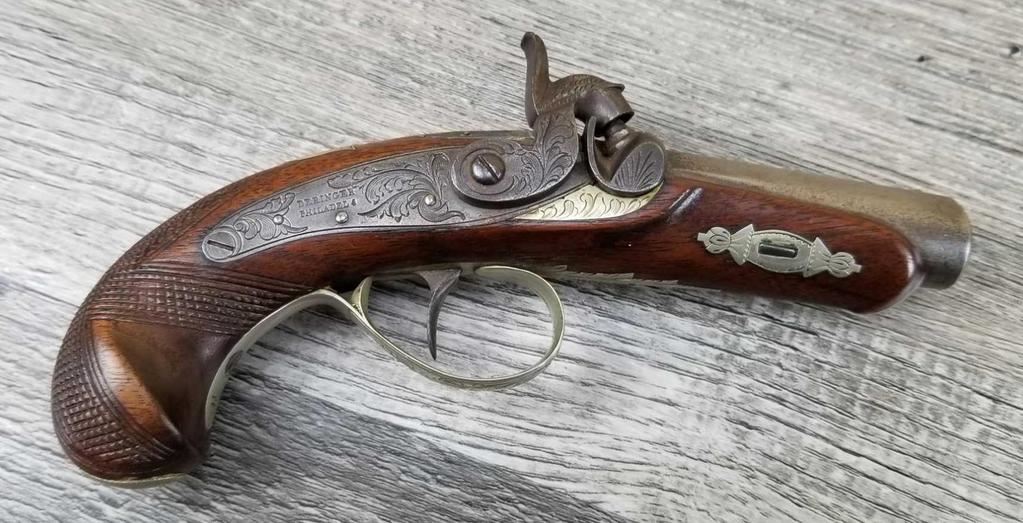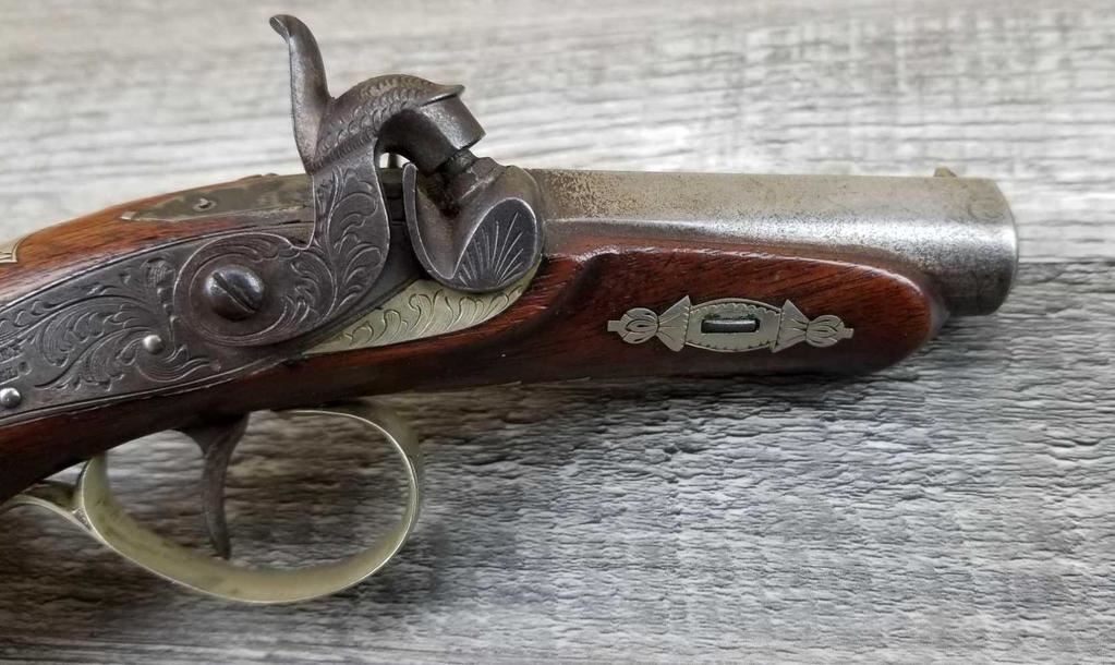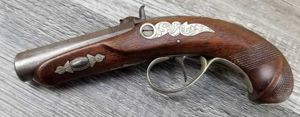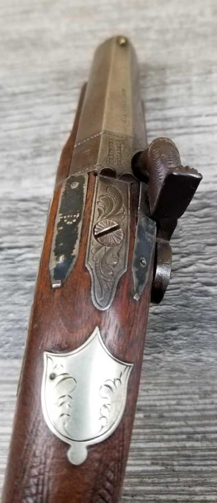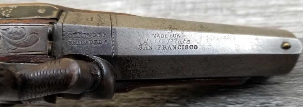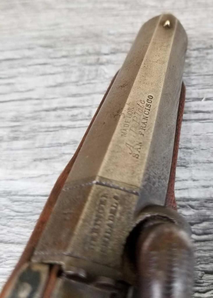 INTERESTING SAN FRANCISCO RETAILER MARKED "MADE FOR A.J. PLATE/SAN FRANCISCO". WITH TWO INTERESTING SILVER PANNELS TO BOTH SIDES OF UPPER TANG. A REAL SAN FRANCISCO GOLD RUSH PISTOL.