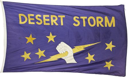 Operation Desert Storm camp flag, approx. 72" x 55", nylon, purple background with a white clenched fist holding a lightning bolt, surrounded by seven yellow stars and "DESERT STORM" appearing above. The flag is constructed of sewn-on pieces and is two-sided. Its frayed corner shows obvious signs that it has flown for an extended period of time.