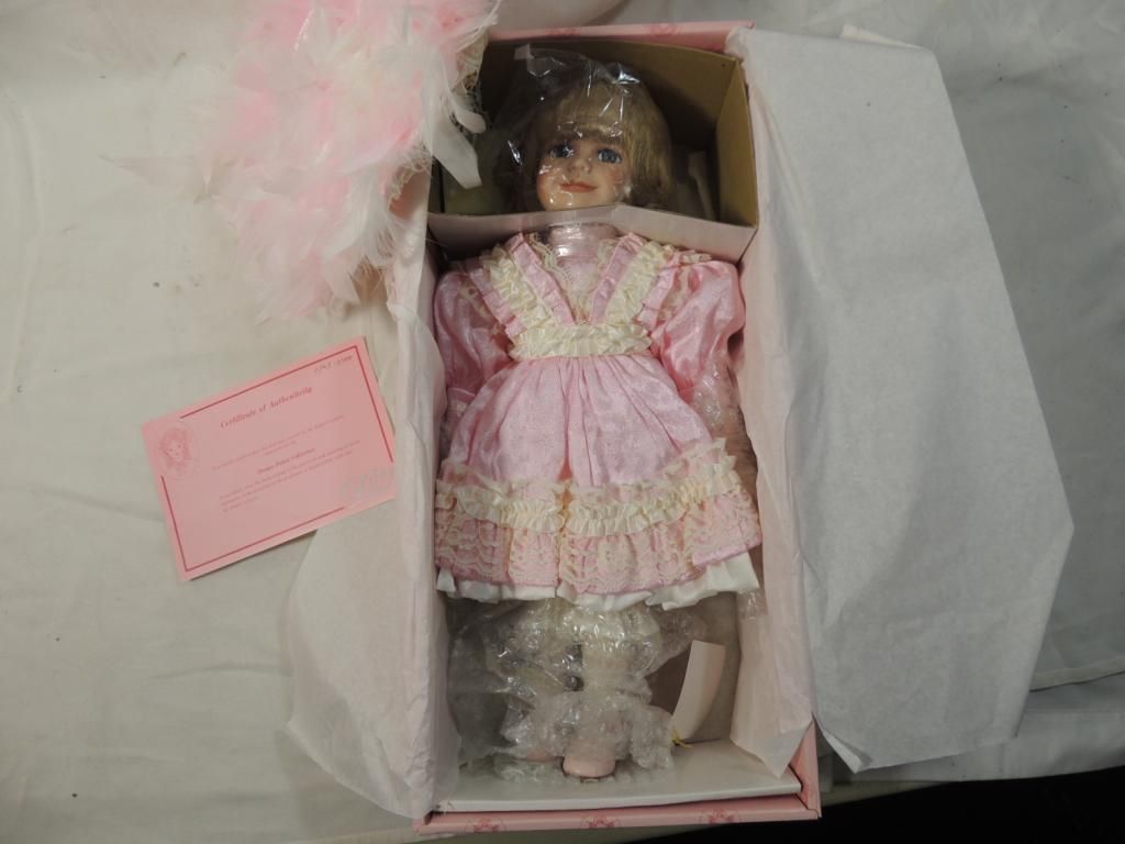 DESIGN DEBUT COLLECTION DOLL 1703/2500 IN ORIGINAL BOX.WRAPPED LIKE SHE WAS WHEN SHIPPED. PINK DRESS AND FEATHER HAT. BLONDE. PINK AND LACE DRESS. 16" TALL. AS SHOWN. SEE PHOTO FOR MORE DETAILS.