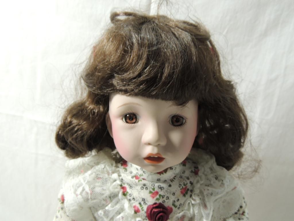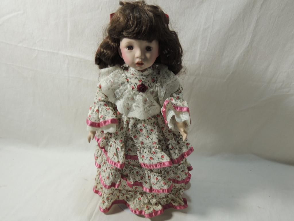14" TALL ON STAND LONG VINTAGE FLORAL RUFFLE DRESS. LACE DETAIL AROUND NECK. LONG BROWN HAIR WITH CURLS AND BANGS. RIBBON BOW IN HAIR. ON STAND. COLLECTIBLE DOLL. IN BOX. COLLECTORS. GOOD CONDITION. AS SHOWN. SEE PHOTO FOR MORE DETAILS.