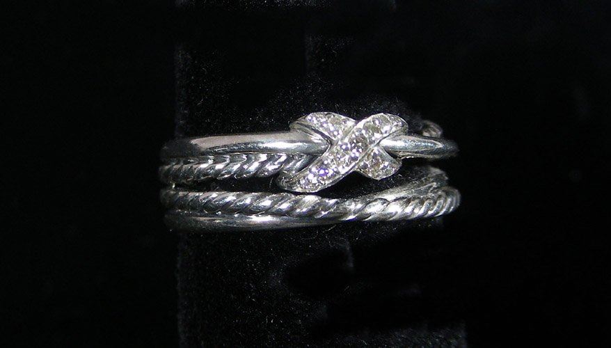 A band ring with "X" set with diamonds. Signed.