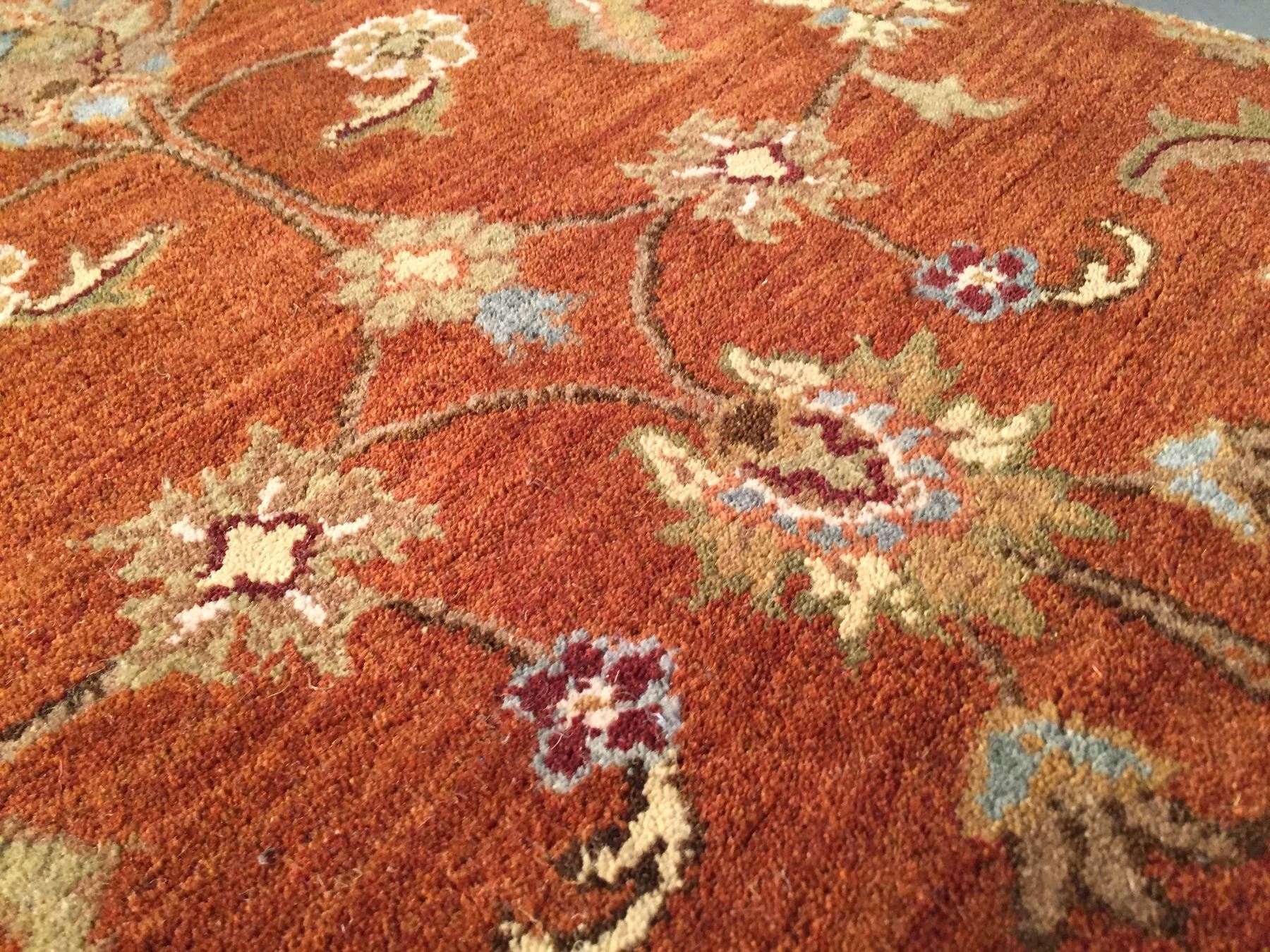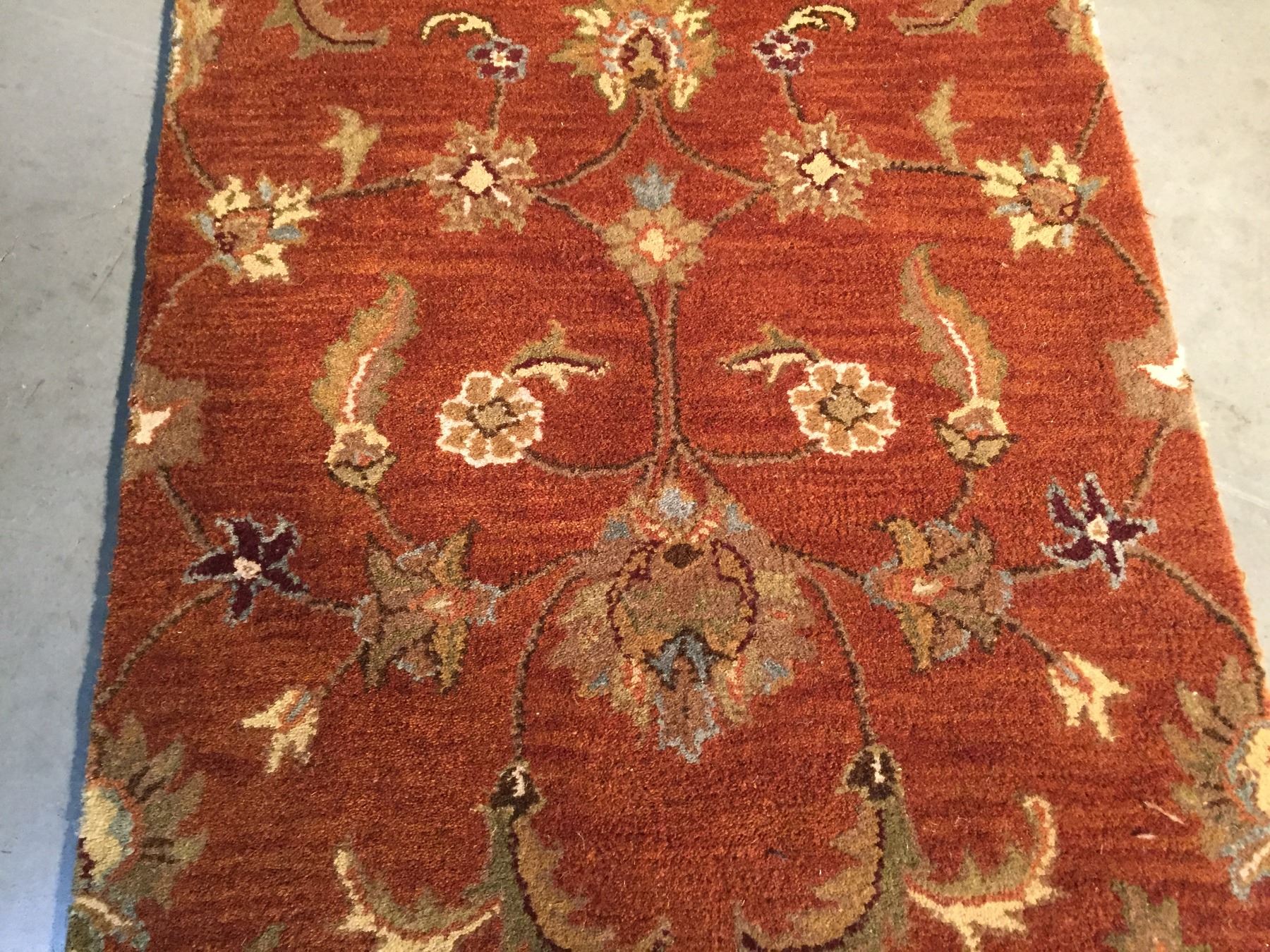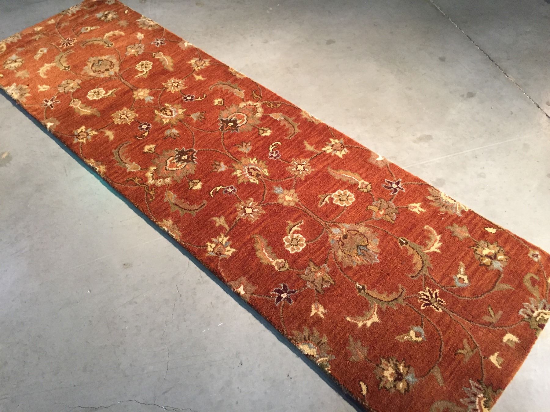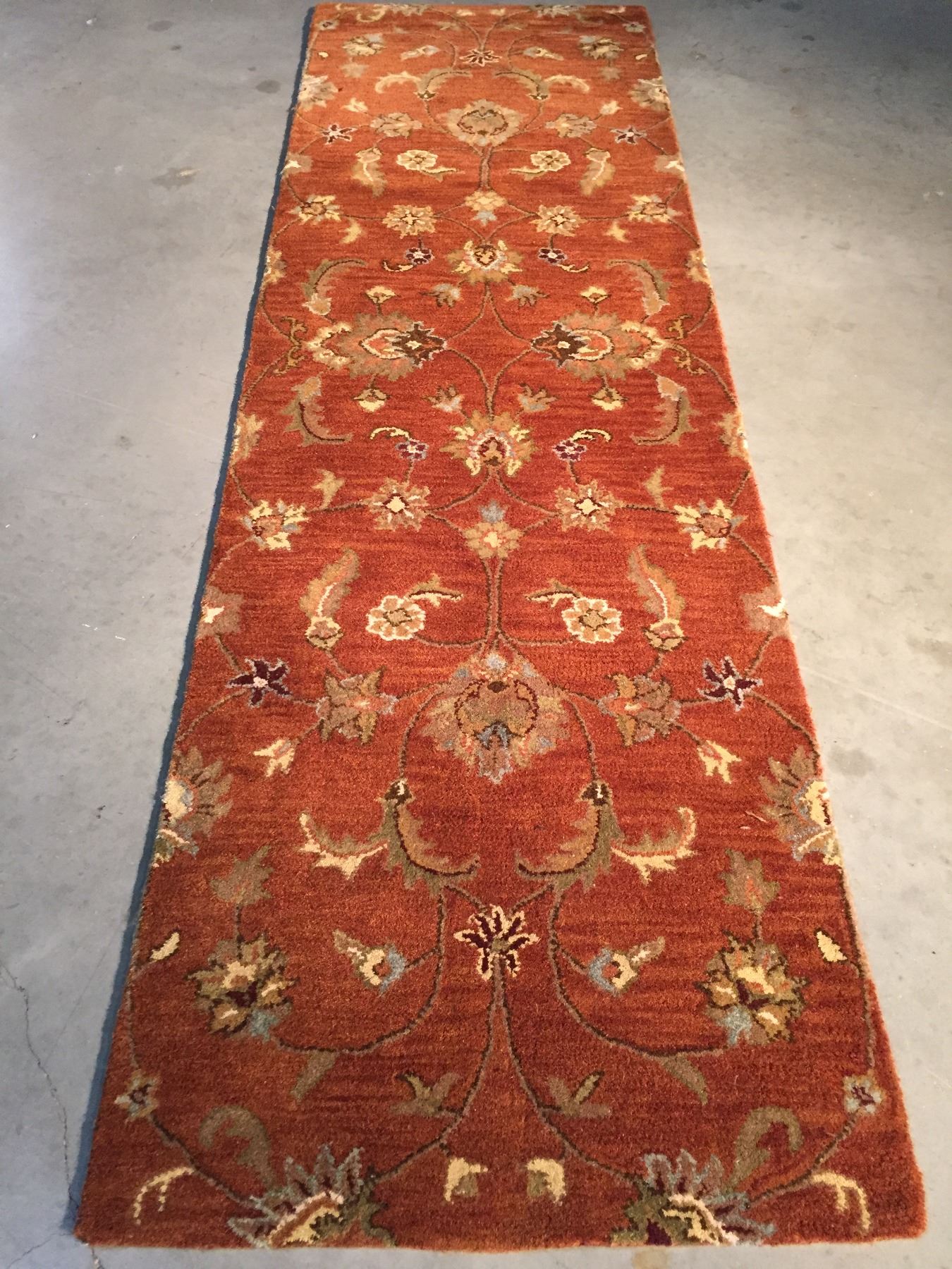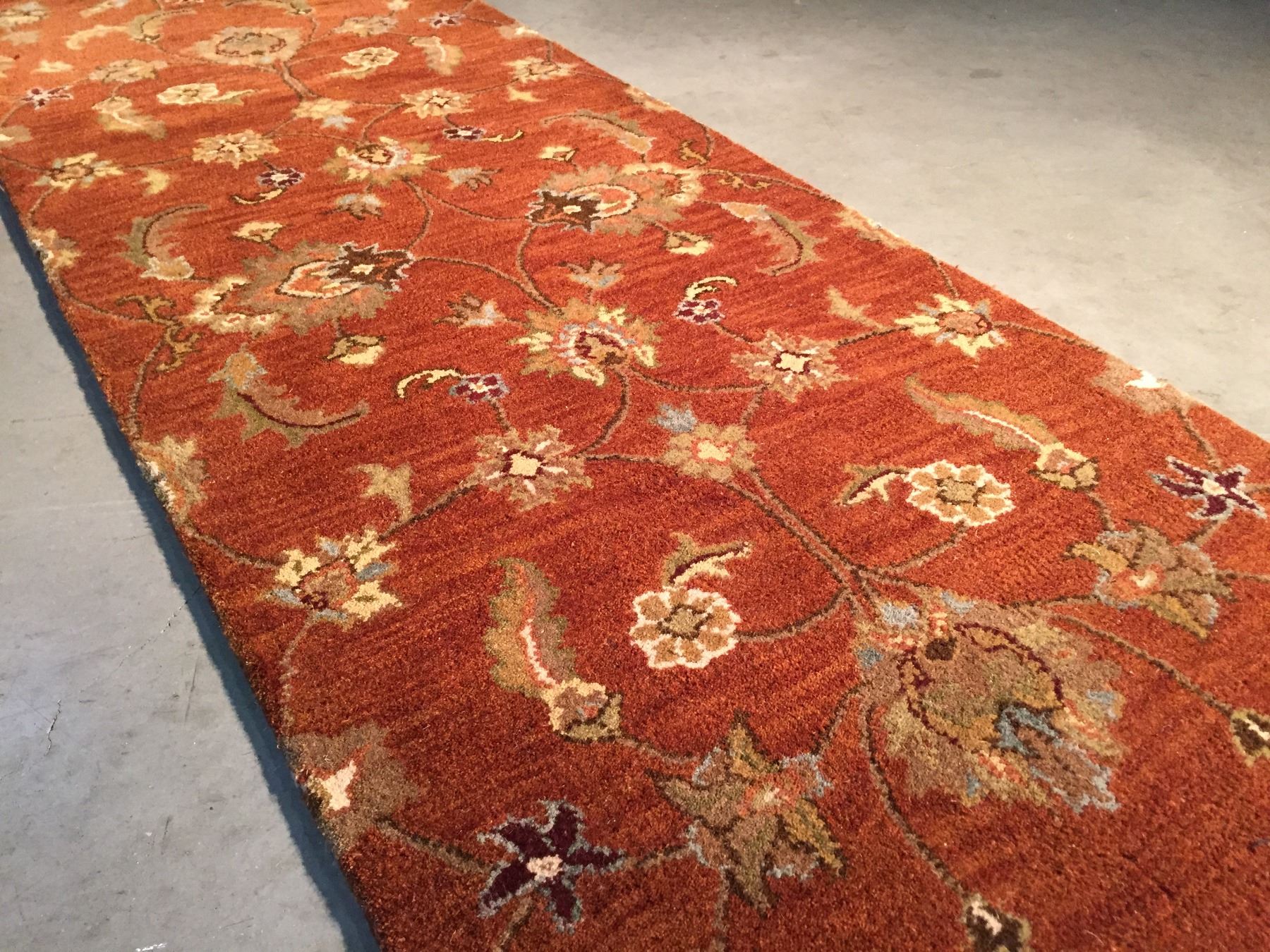2'.3"X7'.9" Decorative Designer Brand Name wool runner rug, textured in rust and multi accent colors, 100% fine and soft natural wool , thick pile, Hand tufted in India.
