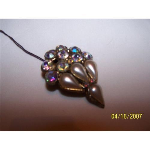 Up for sale is a Designer Unknown ~Aurora Borealis Rhinestone/Pearls~ Broach. The middle pearl has a small spot of the coating that has worn. The back is in a goldtone setting and it does show some slight wear. Other than that, it?s in good condition for its age. It would make a lovely spring/summer brooch.