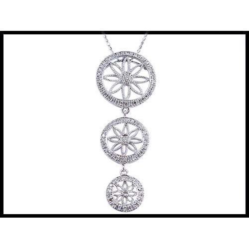 A gifted designer, inspired by Tiffany's jewels, has created this elegant pendant. 3 graduated circles of 14K white gold are set with 92 diamonds. The pendat is 45mm (1-3/4") long. The goldsmith who created it took the time required to do the fine detais at a very high standard. A TREASURE, yet priced for all. No chain.