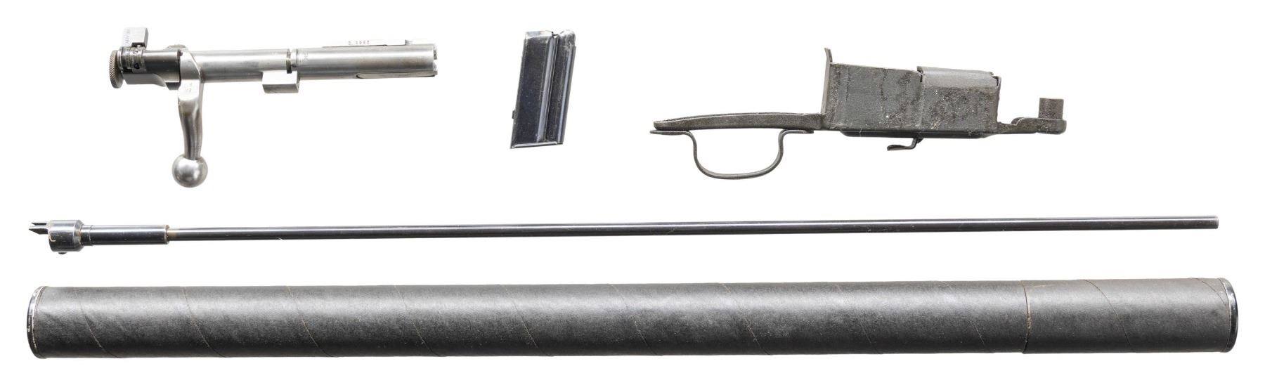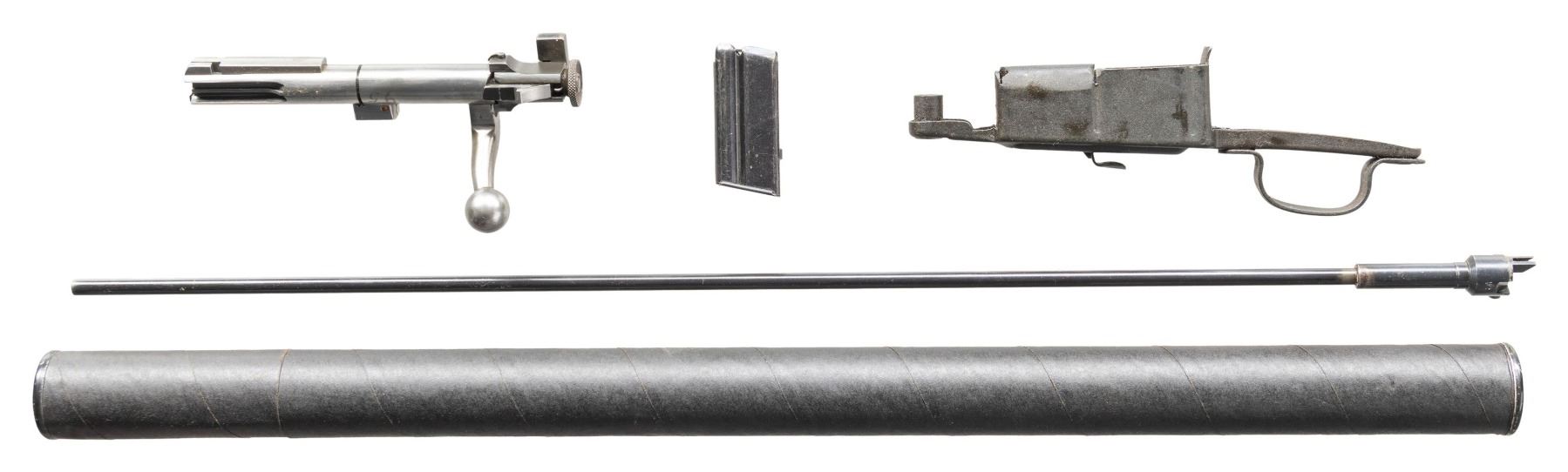 BOLT ACTION MILITARY RIFLES. Cal. .22LR. Serial # 95 (on bolt) Bbl. 24 7/16". These desirable conversion units allow the use of .22 long rifle ammunition for low cost training and target practice. They were made by Numrich Arms in 1959 with a total production of 1,500 units. The blued steel barrels are reported to have been made by Marlin. The bolt is a standard Springfield M-2. Marked "NS" &"M2" and finished bright. The trigger guard is a Remington made small bow type and is modified to hold the removable magazine. The installation tool is not present. MAGS: one 7rd detachable. CONDITION: the parts have very light wear and all appear serviceable. Bore has strong sharp lands with a small degree of lead fouling. (02-24590-8/RW). NON-GUN. $400-600.