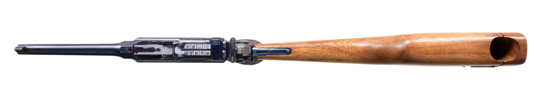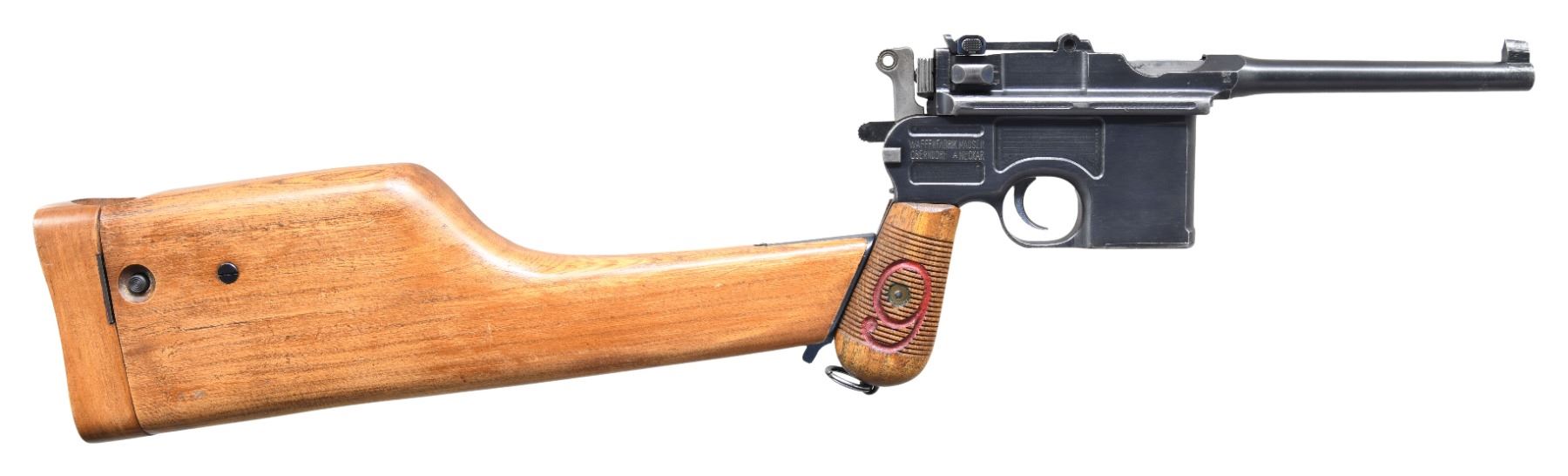 SEMI-AUTOMATIC PISTOL WITH STOCK. Cal. 9mm Luger. S# 95550. Bbl. 5 1/2". C96 "Red 9" semi-automatic pistol mfg. by Mauser for the Imperial German military during World War I. The top of the faceted chamber is marked "WAFFENFABRIK/ MAUSER/ OBERNDORF A/N", with the S# on the left quarter flat, a double crowned "U" commercial proof on the left flat, as well as with 2 Imperial German acceptance proof on the right side. Right side of the frame is marked "WAFFENFABRIK MAUSER/ OBERNDORF A NECKAR", with an Imperial German reichsadler marked on the front of the mag. well. Frame and bbl. extension exhibit what appears to be an original or period arsenal reapplied rust blue finish, with the trigger, safety lever, extractor, rear sight slide, and bolt stop exhibiting a nitre blue finish. Bolt is polished in-the-white. Frame is mounted with 2-piece grooved wood red "9" grips. Fixed blade front sight, with tangent rear sight, graduated 50-500. Nearly all numbers are matching and include the frame, floorplate, lock frame, hammer, locking block, bbl. / bbl. extension, as well as the bolt. Bolt stop is numbered "5540" (possibly indicating an arsenal error), with the sear and grips being unnumbered. UNATTACHED ACCESSORIES: non-matching wood stock holster. Wood parts have been sanded and revarnished, with metal parts exhibiting a reapplied nitre blue finish. CONDITION: excellent, with metal components retaining bountiful amounts of their period arsenal blue finish, exhibiting some areas of light thinning and wear that shows through to gray patina overall. Grooves on left side of the bbl. extension are noticeable soft. Nitre blue parts show some areas of thinning and wear that show through to gray patina. Near mirror bore, exhibiting some spots of light to mild pitting, while retaining well defined rifling throughout. Grips are very good, showing some superficial marks and minor impressions from handling and storage. Stock is good, as sanded and revarnished, exhibiting scattered superficial marks and minor impressions from handling and storage, as well as some losses to the varnish overall. Metal hardware on stock is very good, with some areas of pitting present beneath the bluing. A very attractive example of an always desirable Mauser C96 "Red 9" semi-automatic pistol. (24-6909/MLW). CURIO. $1,500-2,500.
