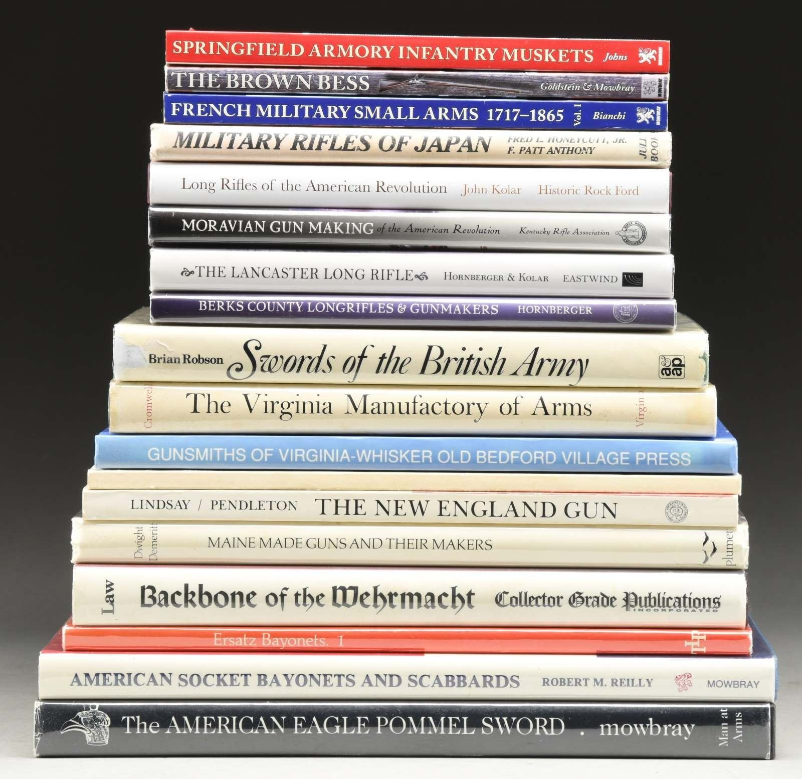 FIREARMS AND EDGED WEAPONS. Books cover a wide range of antique & vintage subjects & are a mixture of hard & soft cover bindings. Notable titles include: Military Rifles of Japan by Honeycutt. / Backbone Of The Wehrmacht by Law. / The Lancaster Long Rifle by Hornberger and Kolar. / Maine Made Guns And Their Makers by Demeritt. / Swords Of The British Army by Robson. / American Socket Bayonets And Scabbards by Reilly. CONDITION: most are in very good condition but may have lightly worn dust jackets, light edge wear & light staining. (02-19866-6/RW). $250-400.