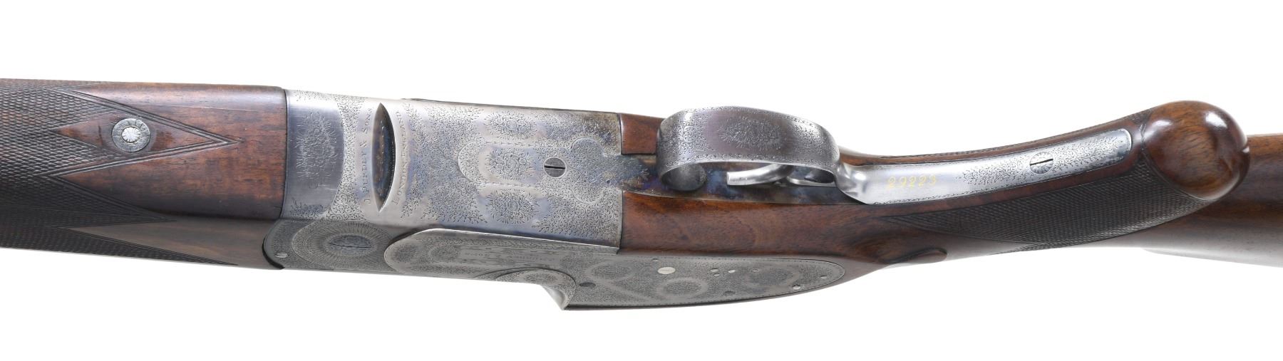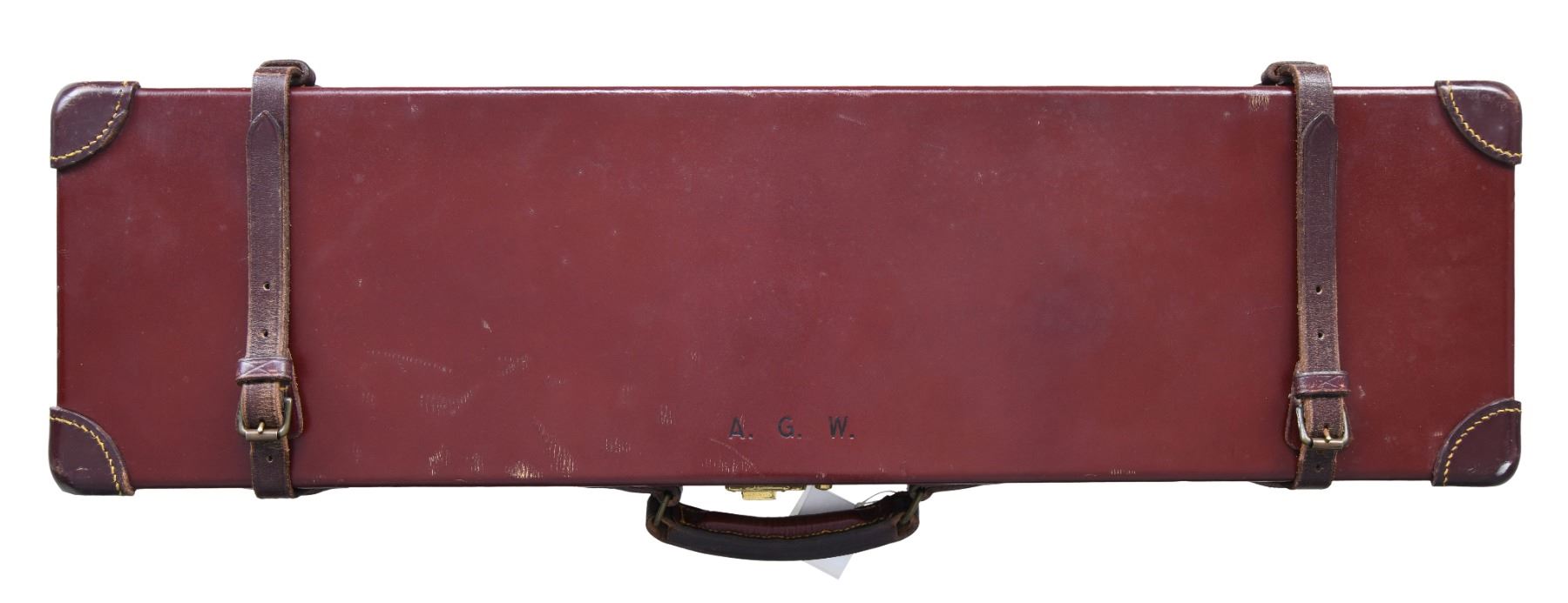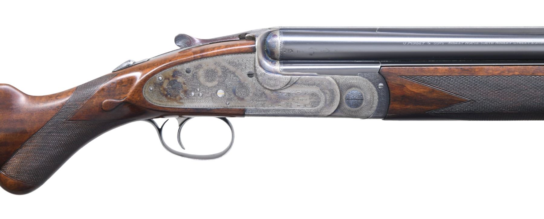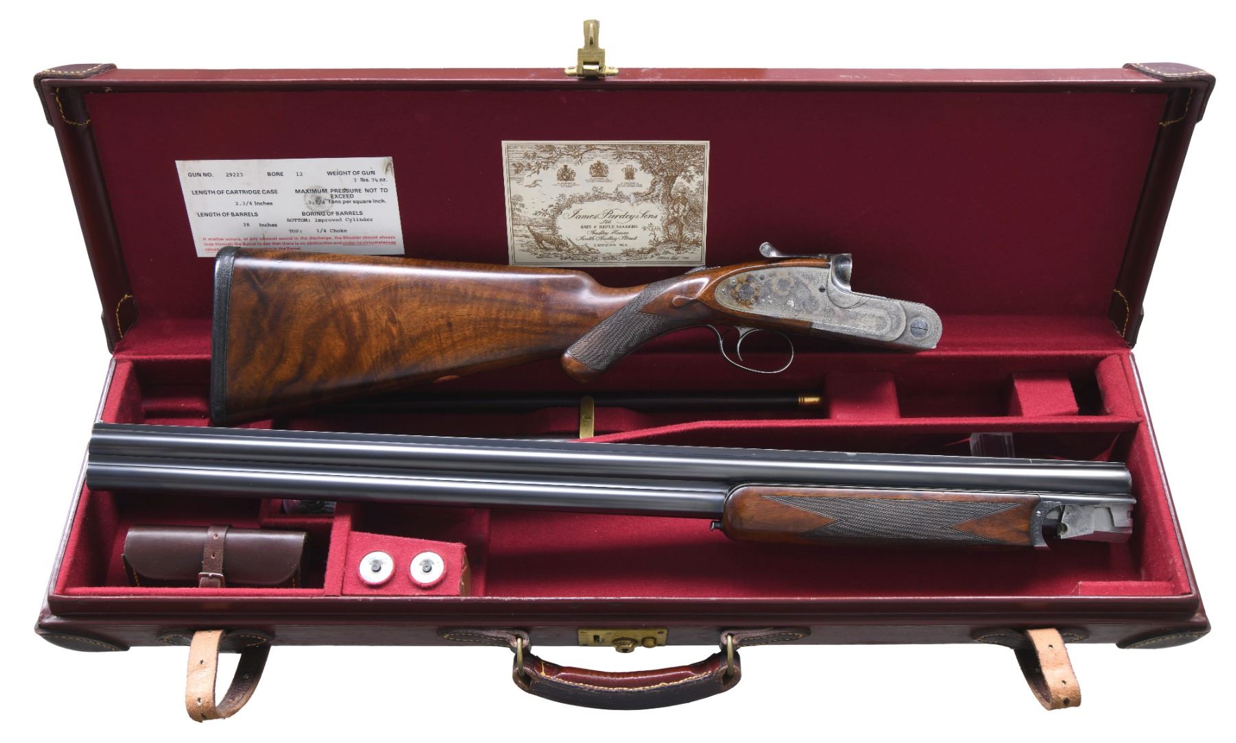 SIDELOCK EJECTOR SINGLE TRIGGER GAME GUN WITH CASE & ACCESSORIES. Cal. 12 Ga. 2-3/4". S# 29223 (1991). Being eminently traditional; Purdey's was late to the market with their over & under shotgun. They tried many designs throughout the teens, 20's & 30's and finally, with their acquisition of Woodward's in 1948, had a satisfactory design patented by Woodward's in 1913. This 12 bore game gun has 28" demi-block barrels fitted with narrow matted solid rib. Right side of top barrel is engraved "J. Purdey & Sons Audley House South Audley Street. London. England." Barrel flats are stamped with 1990 London nitro proofs for 2-3/4" chambers. Bottom barrel is stamped with S# and the unknown # "76687 8". No barrel maker's initials are found. Case hardened low profile sidelock action features automatic safety ("SAFE" inlaid in gold), reinforced frame, gold band tumbler end cocking indicators and single non-selective trigger. Action and lockplates are engraved in traditional Purdey house style with well cut small scroll surrounding rose bouquets. Front of each lockplate is engraved "J. Purdey & Sons" within an ovate scrolled device. Bottom of action is engraved with maker's name and address in front of and behind forend iron mortice. Small bow trigger guard with rose and scroll on bow has S# gold inlaid on tang. Prince of Wales grip buttstock made of lightly crotch figured European walnut measures 15" over thin black leather covered pad. (LOP to end of wood is 14-3/8".) Stock features classic drop points, grip checkering and vacant gold oval. Slim one piece ejector forend with Anson release has initials "AS" on iron. (Tony Smith is listed as a barrel maker in 2012.) MEASUREMENTS: BBLS: Bore Diameter: O .729. U .728. Restriction: O.015 (mod). U .013 (light mod). Wall thickness: O.033. U .034. STOCK: DAH: 2-1/4". DAC: 1-9/16". CAST: about 1/2" off. LOP: 15". WEIGHT: 7 lb. 12 oz. UNATTACHED ACCESSORIES: gun is housed in what appears to be its original brown leather VC case with stitched leather corners. Top is embossed "A.G.W.". Interior is lined in burgundy cloth. A paper label of the type used 1986-91 is in lid. Also present is a charge card for this particular gun with specifications and chokes. Case contains two piece cleaning rod with mop, jag and brush in leather wallet. Purdey bench cloth, round plated oil bottle and two Purdey marked snap caps. CONDITION: very fine with some partial refinishing. Barrels retaining nearly 95% of what appears to be original blue with some touched up marks and scratches most notably a fair sized ding in left side of rib about 9" from breech end. Action retains over 85% original color which shows some thinning overall and silvering on beads and fences. Top lever shows considerable silvering of its blue and pivot screw appears to have been refinished and should be re-engraved. Safety button and area at rear of top tang is considerably silvered. Trigger guard retains about 40% blue with heavy silvering on tang. Forend iron shows some silvering on bottom left. Mounting screw is out of time. Stocks appear to have had a light oil refinish with checkering somewhat filled and worn. Bores are bright and shiny without any noted problems, except some light frosting toward breech end of bottom barrel. Action is tight; barrels on face. Ejectors slightly out of time; trigger seems to work well. Case leather is very fine with some minor scrapes and rubs. Straps and handle are good. Interior cloth is fine. Label is fine. Charge card shows some soiling and light foxing. Accessories are fine. (25-934/MGM). MODERN. $30,000-50,000.