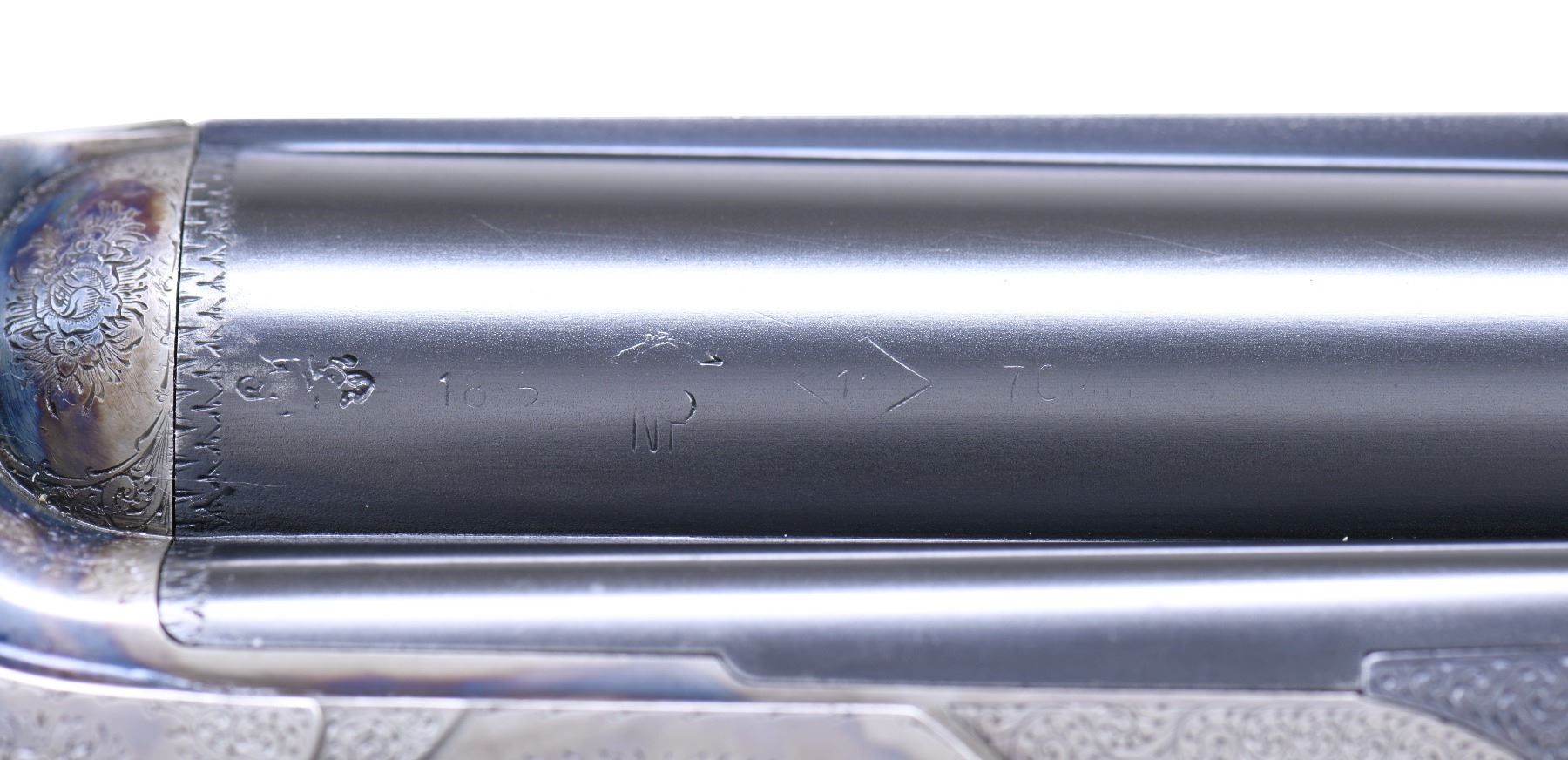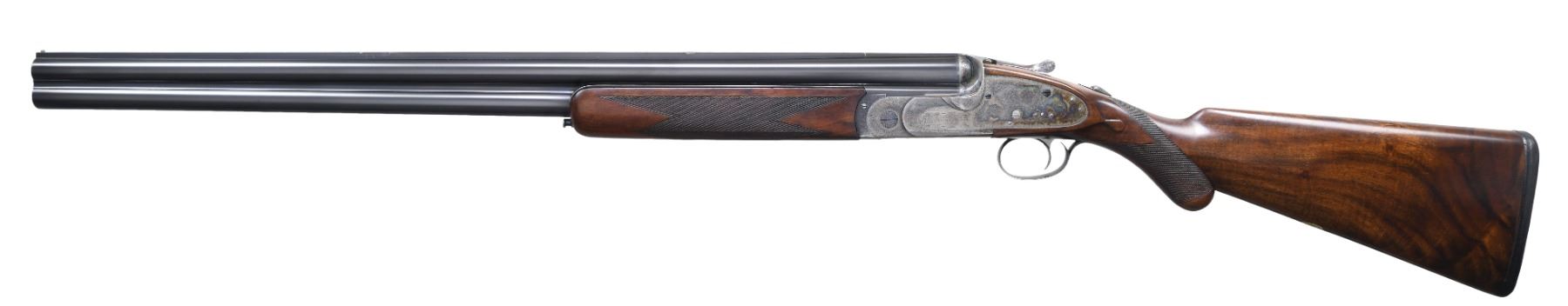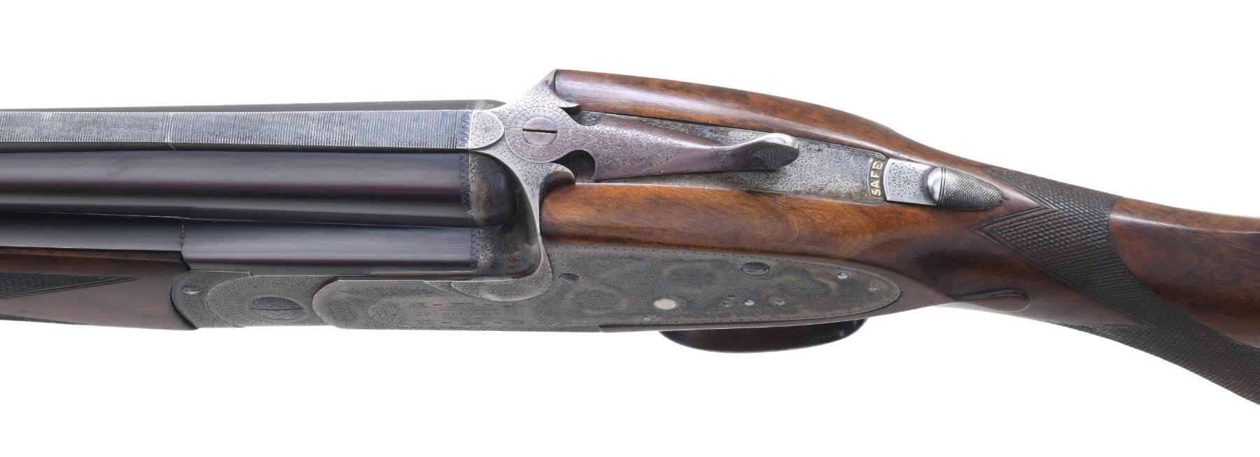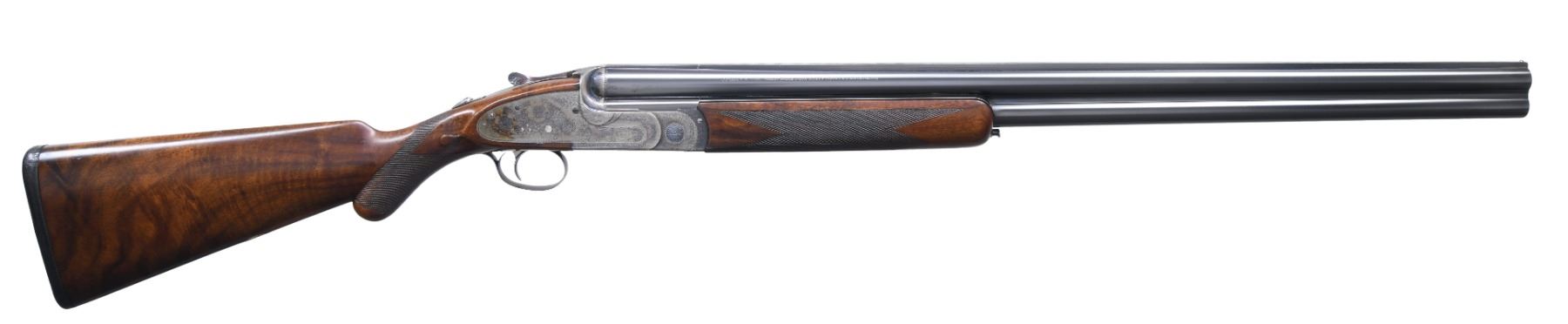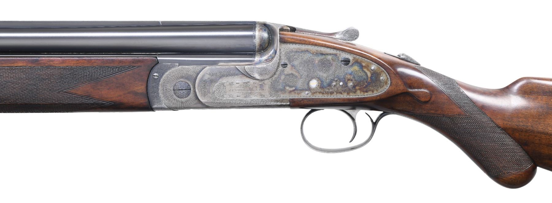 SIDELOCK EJECTOR SINGLE TRIGGER GAME GUN WITH CASE & ACCESSORIES. Cal. 12 Ga. 2-3/4". S# 29223 (1991). Being eminently traditional; Purdey's was late to the market with their over & under shotgun. They tried many designs throughout the teens, 20's & 30's and finally, with their acquisition of Woodward's in 1948, had a satisfactory design patented by Woodward's in 1913. This 12 bore game gun has 28" demi-block barrels fitted with narrow matted solid rib. Right side of top barrel is engraved "J. Purdey & Sons Audley House South Audley Street. London. England." Barrel flats are stamped with 1990 London nitro proofs for 2-3/4" chambers. Bottom barrel is stamped with S# and the unknown # "76687 8". No barrel maker's initials are found. Case hardened low profile sidelock action features automatic safety ("SAFE" inlaid in gold), reinforced frame, gold band tumbler end cocking indicators and single non-selective trigger. Action and lockplates are engraved in traditional Purdey house style with well cut small scroll surrounding rose bouquets. Front of each lockplate is engraved "J. Purdey & Sons" within an ovate scrolled device. Bottom of action is engraved with maker's name and address in front of and behind forend iron mortice. Small bow trigger guard with rose and scroll on bow has S# gold inlaid on tang. Prince of Wales grip buttstock made of lightly crotch figured European walnut measures 15" over thin black leather covered pad. (LOP to end of wood is 14-3/8".) Stock features classic drop points, grip checkering and vacant gold oval. Slim one piece ejector forend with Anson release has initials "AS" on iron. (Tony Smith is listed as a barrel maker in 2012.) MEASUREMENTS: BBLS: Bore Diameter: O .729. U .728. Restriction: O.015 (mod). U .013 (light mod). Wall thickness: O.033. U .034. STOCK: DAH: 2-1/4". DAC: 1-9/16". CAST: about 1/2" off. LOP: 15". WEIGHT: 7 lb. 12 oz. UNATTACHED ACCESSORIES: gun is housed in what appears to be its original brown leather VC case with stitched leather corners. Top is embossed "A.G.W.". Interior is lined in burgundy cloth. A paper label of the type used 1986-91 is in lid. Also present is a charge card for this particular gun with specifications and chokes. Case contains two piece cleaning rod with mop, jag and brush in leather wallet. Purdey bench cloth, round plated oil bottle and two Purdey marked snap caps. CONDITION: very fine with some partial refinishing. Barrels retaining nearly 95% of what appears to be original blue with some touched up marks and scratches most notably a fair sized ding in left side of rib about 9" from breech end. Action retains over 85% original color which shows some thinning overall and silvering on beads and fences. Top lever shows considerable silvering of its blue and pivot screw appears to have been refinished and should be re-engraved. Safety button and area at rear of top tang is considerably silvered. Trigger guard retains about 40% blue with heavy silvering on tang. Forend iron shows some silvering on bottom left. Mounting screw is out of time. Stocks appear to have had a light oil refinish with checkering somewhat filled and worn. Bores are bright and shiny without any noted problems, except some light frosting toward breech end of bottom barrel. Action is tight; barrels on face. Ejectors slightly out of time; trigger seems to work well. Case leather is very fine with some minor scrapes and rubs. Straps and handle are good. Interior cloth is fine. Label is fine. Charge card shows some soiling and light foxing. Accessories are fine. (25-934/MGM). MODERN. $30,000-50,000.
