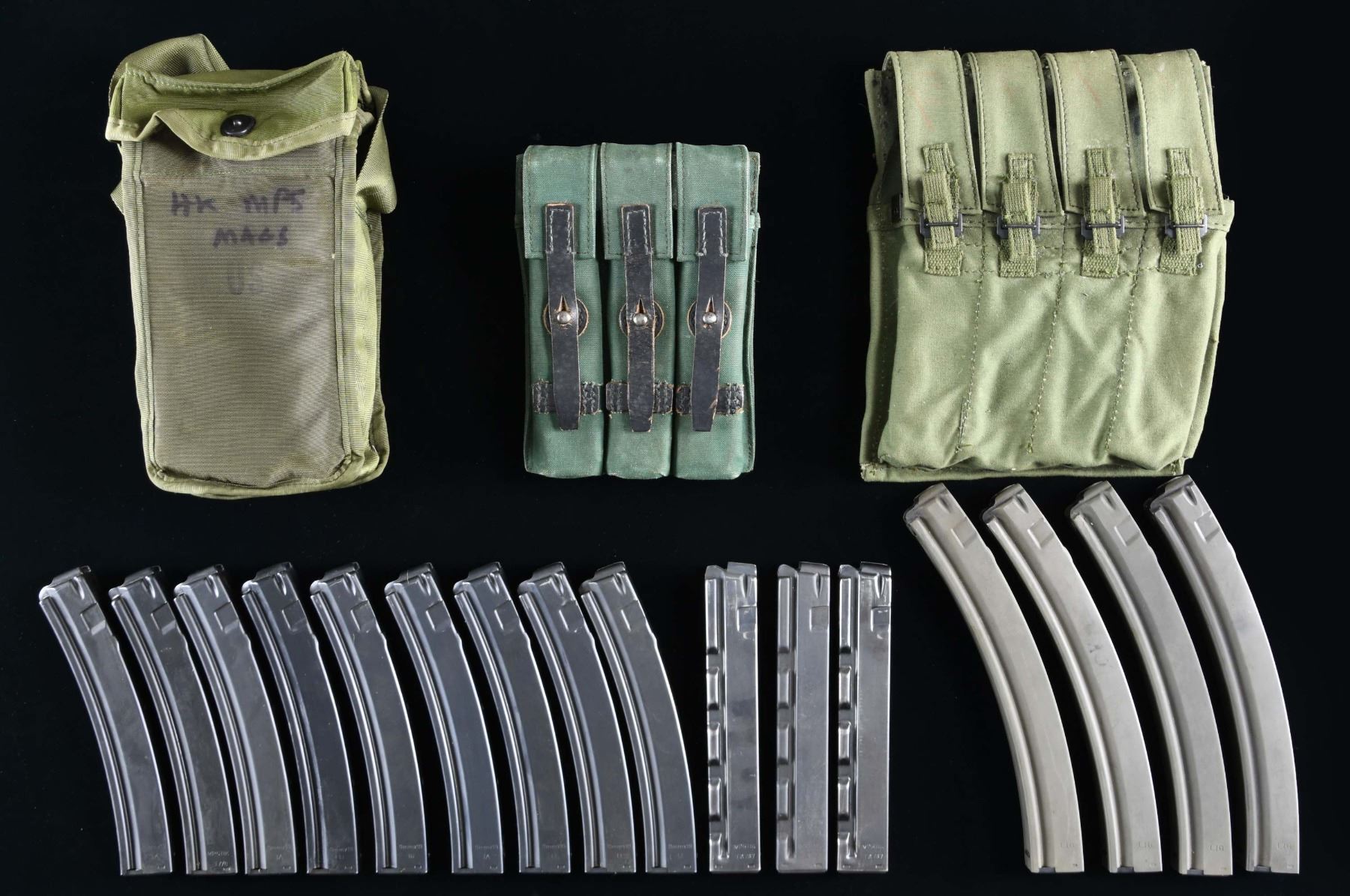 Desirable lot of 16 assorted MP5 mags., including: 1) 3 HK MP5 30-rd. straight mags. (2 with "10/67" dates, 1 with "12/72" date) in 3-cell canvas mag. pouch. 2) 9 HK MP5 30-rd. curved mags. (1 with "1/78" date, 3 with "JA" (80) date codes, 1 with "IG" (86) date code, 3 with "IJ" (88) date codes, and 1 "POF" marked mag.). in green nylon pouch. 3) 4 40-rd. "LIQ" marked mags. in 4-cell green canvas carrier. CONDITION: very good, with mags. exhibiting mild wear and thinning from handling, storage, and use. Pouches exhibit mild wear, but otherwise remain sturdy and serviceable. (02-23739/MLW). $500-1,000.
