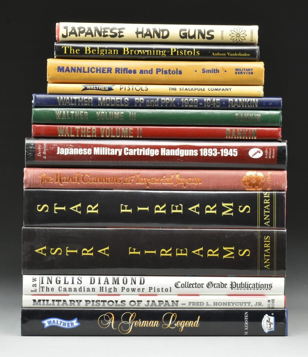 This lot consists of 14 hardcover books primarily on European & Japanese handguns. 1. the first book is The Inglis Diamond the Canadian High Power Pistol by Clive M Law. This book shows some staining & scuffing on the dust jacket. 2. the second book is Japanese Hand Guns by Frederick E. Leithe. The dust jacket shows some light tears, fraying & crazing. 3. the third book is Astra Firearms and Selected Competitors by Leonardo M. Antaris. The inside of this book is signed by the author. The edges of the dust jacket show some crazing. 4. The fourth book is Star Firearms by Leonardo M. Antaris. The book has a personal note from the author on the inside. The dust jacket of this book shows some staining & crazing. 5. the fifth book is Mannlicher Rifles & Pistols by Walther H.B. Smith. No dust jacket is present. The book has an inscription on the inside cover & it shows moderate shelf wear. 6. the sixth book is Japanese Military Cartridge Handguns 1893-1945 by Harry Derby & James Brown. The dust cover shows some crazing & light wear. 7. the seventh book is The Hand Cannons of Imperial Japan by Harry Derby. There is no dust cover present. The book shows moderate shelf wear. 8. the eighth book is military Pistols of Japan by Fred Honeycutt. The laminated dust cover shows moderate shelf wear. 9. the ninth book is the 2001 edition of The Belgian Browning Pistols by Anthony Vanderlinden. The edges of the dust cover show crazing & shelf wear. 10-12 the tenth through 12th books are Volume 1-3 of James Rankin's Walther books. They show light scuffing, dust staining & shelf wear. 13. the thirteenth book is Walther Pistols by W.H.B. Smith. This book shows scattered scuffing, shelf wear & dust staining. 14. the fourteenth book is Walther A German Legend by Manfred Kersten. The dust cover shows crazing most notably at the top of the back side. (02-16954-5/MJC). $300-500.