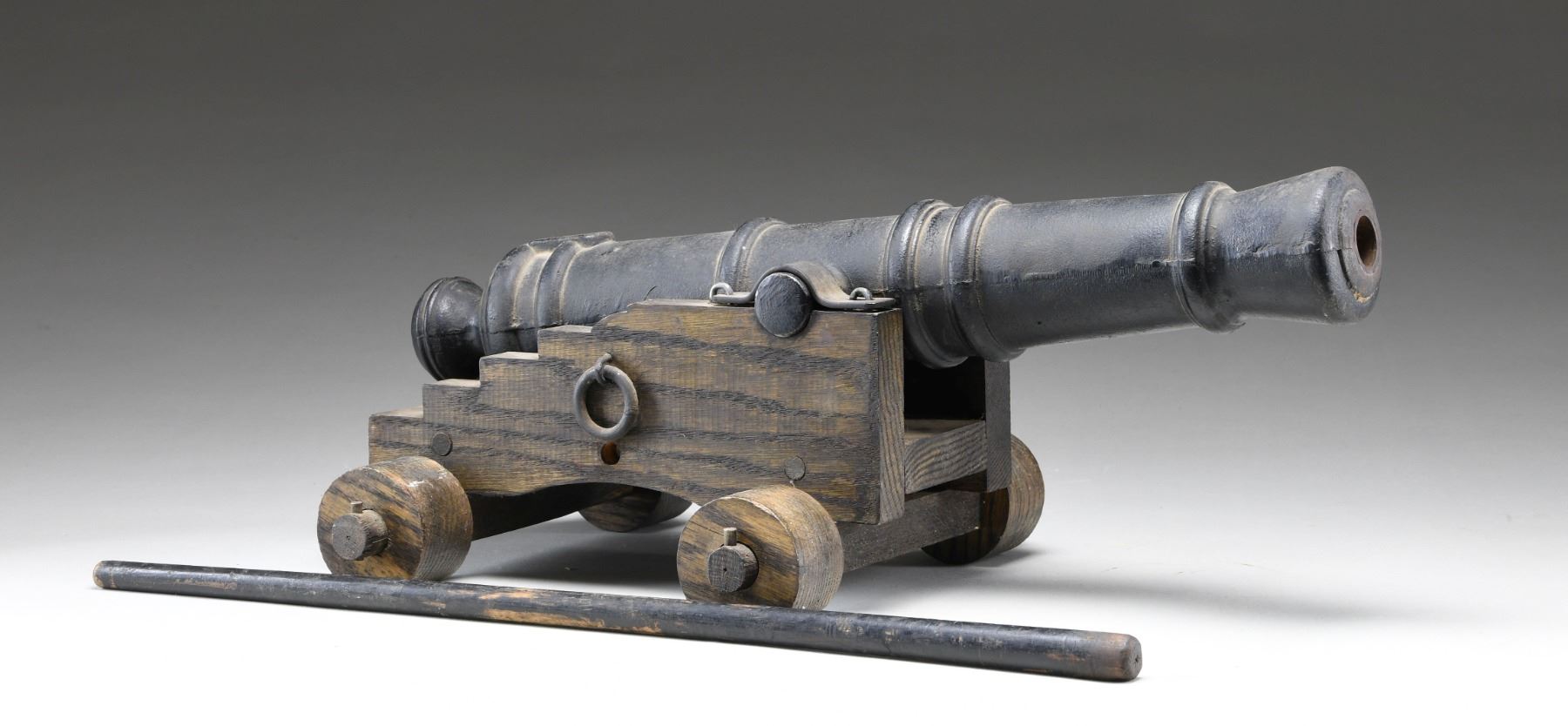 Cannon is made w/ a 23" cast iron barrel approx. 3 1/2" in diameter at the breech. Barrel has steel liner w/ approx. 1" bore. Vent has been drilled 5/32. Barrel resembles guns from the 18th & 19th centuries w/ nice details, but showing prominent mold line. Center-line trunnions. Mounted on reproduction oak naval style carriage w/ wooden wheels. Carriage measures approx. 12" wide, 12 3/4" long & 7" tall. The overall length w/ the cannon mounted on the carriage is approx. 22 1/2". UNATTACHED ACCESSORIES: 24" wooden ramrod. CONDITION: cannon barrel has wear, thinning & flaking of the black painted finish. Dark stained carriage has light wear. Bore has oxidation & light pitting throughout. (02-23964/RW). NON-GUN. $1,000-2,000.