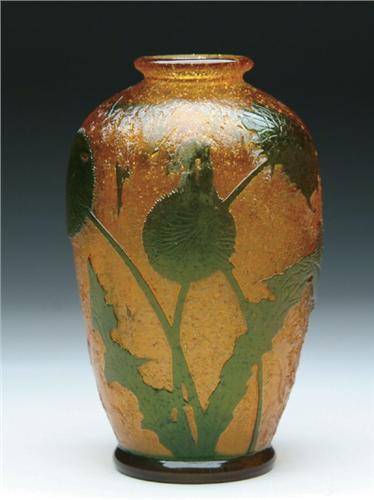 DESIRE CHRISTIAN CAMEO VASE. Outstanding cameo vase has green cameo flowers, stems and leaves against a highly textured amber background with gold flecks throughout. Signed on the underside "Christian Misenthal Loth". SIZE: 7 in. t. CONDITION: Very good to excellent. 5-61094