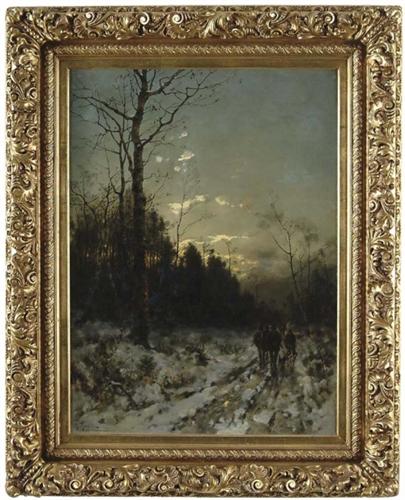 DESIRE THOMASSIN RENARDT (Austrian, 1858-1933) BACK FROM THE HUNT. Large oil on canvas evening scene shows five hunters with dogs walking on a snow covered dirt road through large forested area with clearing. A setting sun still casts light on the clouds. Signed lower left “Th. Renardt 1897” which appears to be over an earlier signature. Housed in a magnificent gilt gesso decorated fancy frame. SIZE: 29-1/2” x 22”. CONDITION: Relined, inpainting. Very good. 9-27430