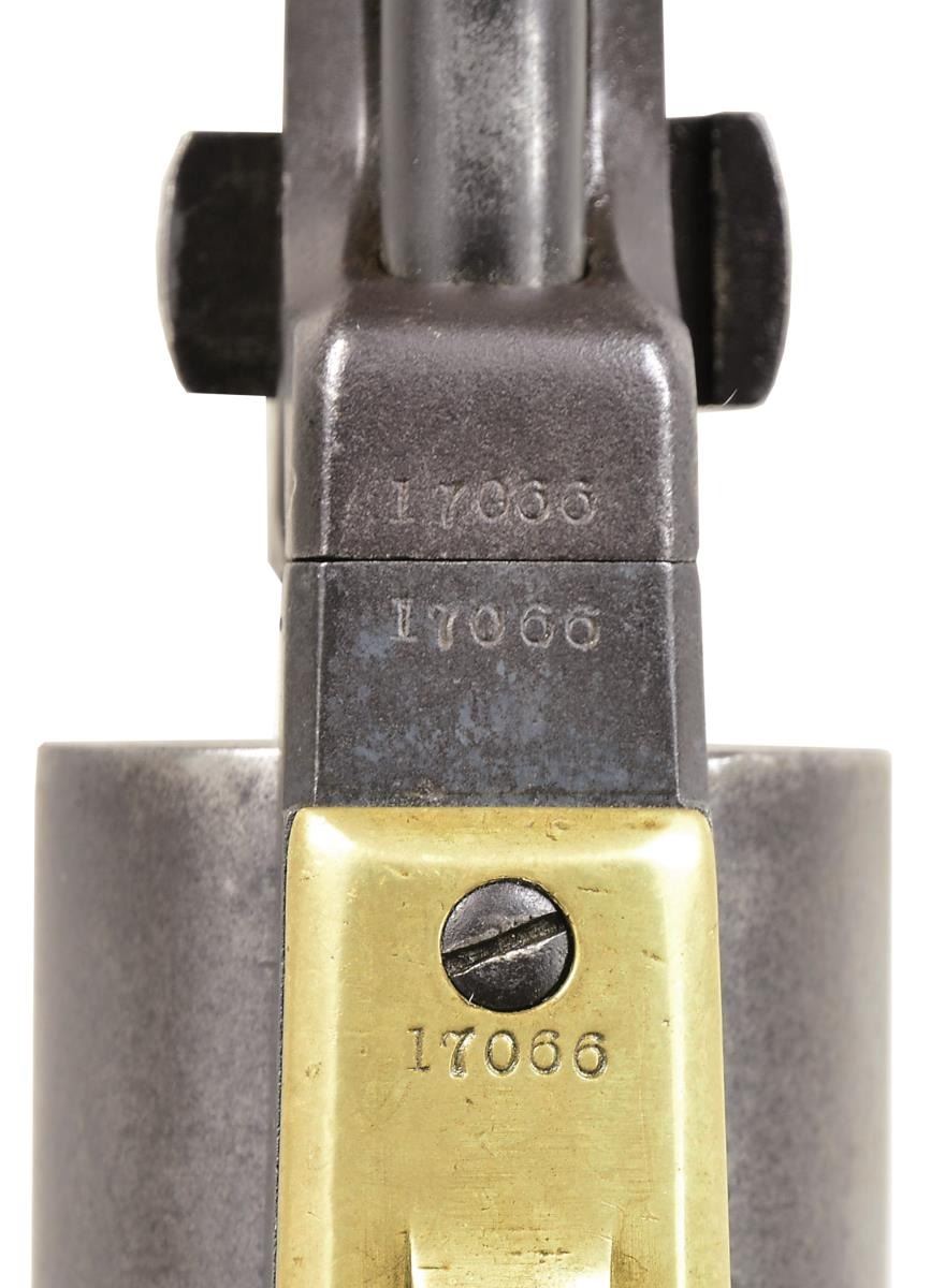 SHOULDER STOCK. Cal. 44. S# 17066. Colt produced only about 1500 of these 3rd models that were cut for shoulder stock & equipped w/ three position carbine sights on the bbl. Manufactured in 1858, most, if not all, saw Civil War use & are seldom found in untouched condition. This gun is one of the earliest Colt Dragoons to have the improved horizontal rammer latch which was modified in the early 17000 serial range. It retains all original matching serial numbered parts, including the bbl. wedge & is in near excellent mechanical condition. All numbers & markings are sharp & clear, including the "US" stamped below "COLTS PATENT" on the frame & two of the original safety pins remain on the cylinder. CONDITION: the bore is fair & shows some pitting, the exterior of the gun shows scattered minor denting w/ an even, brown patina. The walnut grips are near excellent, w/ only modest wear, & show no cracks or chips on the corners. Overall, the gun appears untouched & in a natural aged condition. Approximately 20% of the cylinder scene remains & all nipples are in good condition & appear original to the date of manufacture. The action is smooth & locks up tight. This is a very nice example of the rare shoulder stock variation of the Colt Dragoon that is unmolested. (01-18684/CL). ANTIQUE. $7,000-11,000.