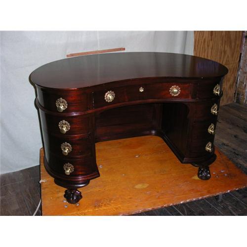 A VERY SOLID HAND MADE KIDNEY SHAPED DESK OF GREAT STYLE AND CRAFTSMANSHIP. IT HAS SOME SIGNS OF USE BUT OVERALL THE DESK IS IN VERY GOOD ORIGINAL CONDITION BOTH IN STRUCTURE AND APPEARANCE. IT IS FINISHED ALL AROUND WITH AN AJUSTABLE BOOK SHELF ON THE OPPOSITE SIDE OF THE DRAWERS. IT SITS ON BEAUTIFULLY CARVED CLAW AND BALL FEET AND LOOKS GREAT ANYWHERE IN A ROOM.