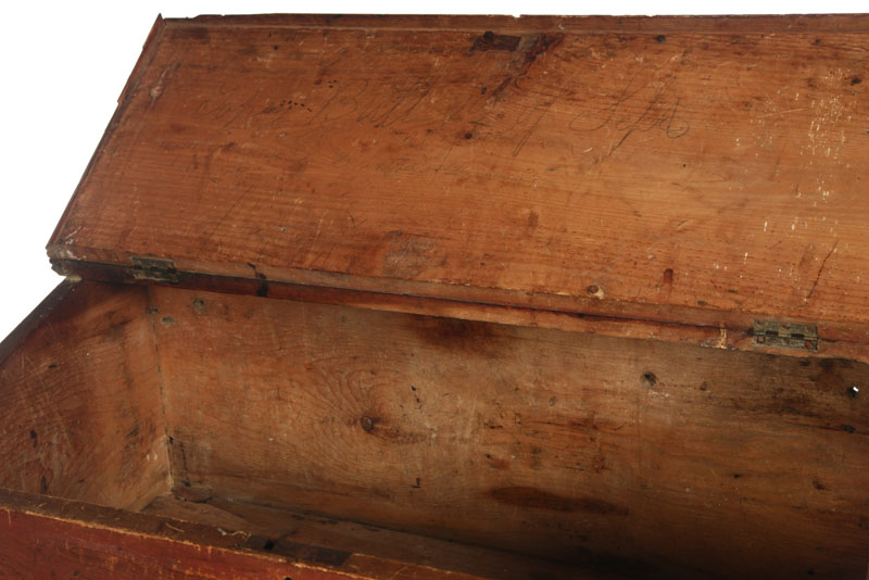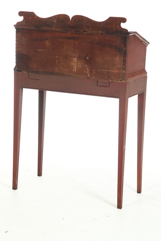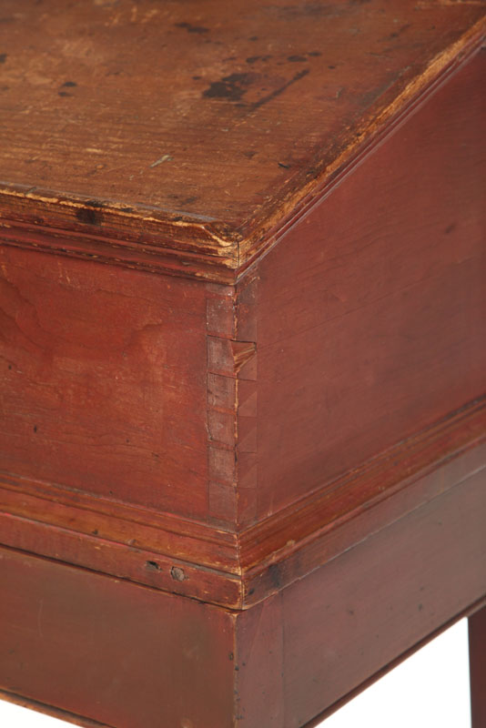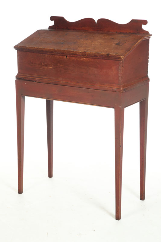 American,19th century, pine with old red. Dovetailed case, applied base and lid edge moldings, slant top lid and shaped crest. Imperfections. 15 1/2"h. 30 1/2"w. 15"d. With a modern reproduction tapered leg base. 31"h.
