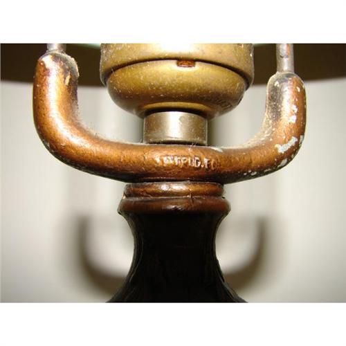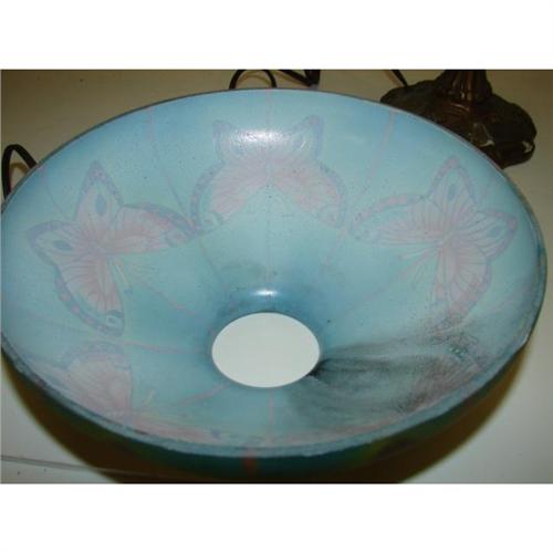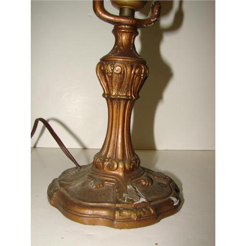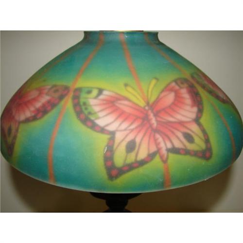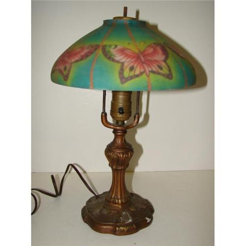 DESK LAMP WITH SHADE. Consists of an ornate gilt painted metal lamp base with a reverse painted shade decorated with butterflies. Shade is a possible marriage to lamp base with a missing top finial. Shade shows a small chip at top rim. Electrified. 14.25” H