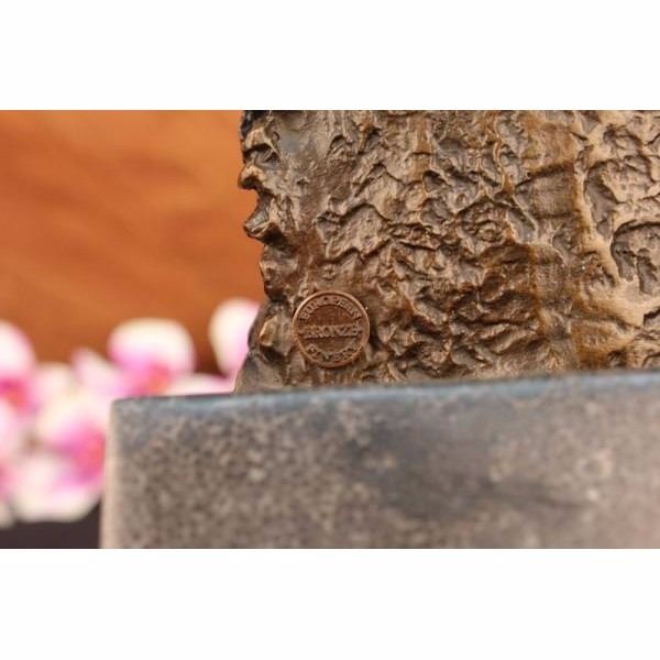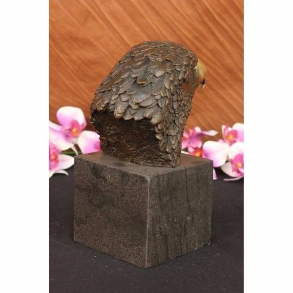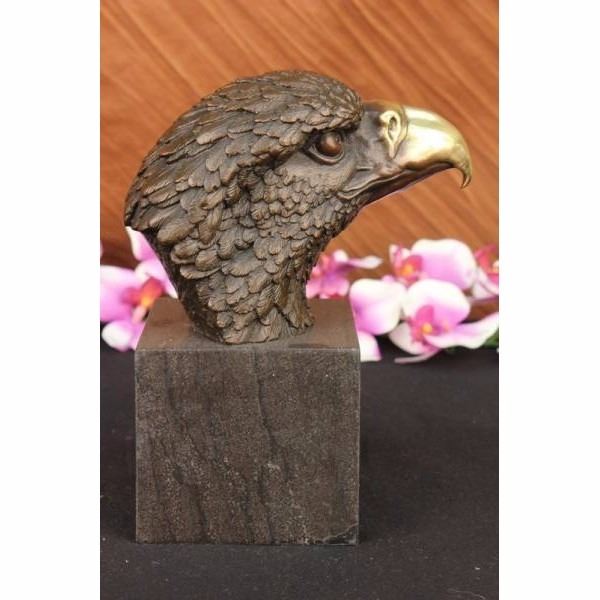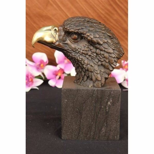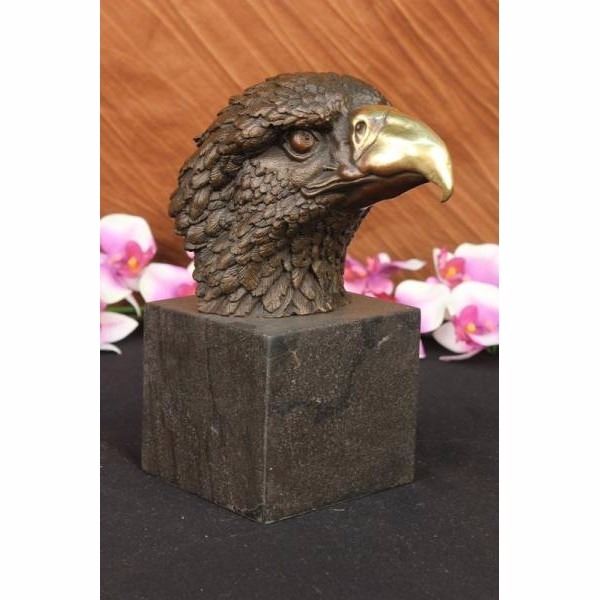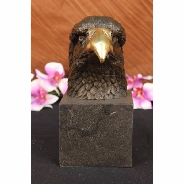 The bust of the eagle head captures the essence of the majestic bird of prey. The eagle's very large hooked beak (coated in a gold patina) is used for tearing flesh from their unfortunate prey. The extremely keen eyesight of the eagle stares out spotting a potential prey from a very long distance. Through the ages and different cultures, the eagle has represented spiritual protection, carrier of prayers, strength, courage, wisdom, illumination of spirit, healing, creation, and a knowledge of magic. The eagle has an ability to see hidden spiritual truths, rising above the material to see the spiritual. The eagle has an ability to see the overall pattern, and the connection to spirit guides and teachers. The eagle represents great power and balance, dignity with grace, a connection with higher truths, intuition and a creative spirit grace achieved through knowledge and hard work. The handmade bronze sculpture was captured using the ancient method of lost-wax casting and with feathers stained with a brown patina tarnish. The sculpture is mounted upon a black marble base. Condition: This sculpture is in perfect condition. Bronze Dimensions with Marble Base:Height 8 1/2" x Width 4" Marble Dimensions:4" X 4" Height without base: 4 1/2" Weight :10 LBS Inventory : 25Y070-13152