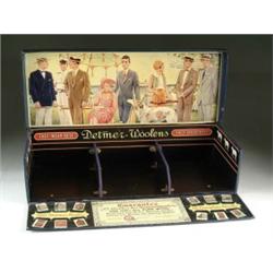 DETMER WOOLENS STORE DISPLAY. Hard shell case display features a rear-hinged lid with an illustration of a social summer gathering fashionably clothed in Detmer woolens. SIZE: 28” w. x 11” d. x 18” h. (open). CONDITION: Very good. PF 1-4582 (200-400)