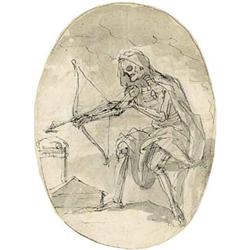 Sitzender Tod mit Pfeil und Bogen, im Hintergrund antike Ruinen. Darstellung im Oval. Lavierte Tuschfederzeichnung um 1600. - Auf der Unterlage alt an Niklas Manuel Deutsch zugeschrieben. Größe: 18,5 x 13,5 cm. Alt aufgezogen, gering stockfleckig sowie mit teils durchscheinenden Klebespuren. Sammlung A. Freiherr von Lanna (Lugt 2773).
