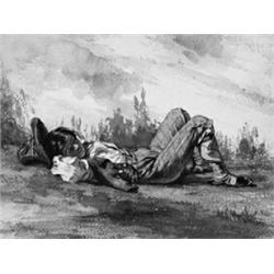 Eine Ruhepause. Im Gras liegender Knabe. Aquarell. - In der linken unteren Ecke in Bleistift bezeichnet “Carl Rottmann” (?). Auf kräftigem chamoisfarbenen “Whatman Turkey Mill 1853”-Vélin. Größe: 22,8 x 30 cm.