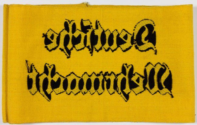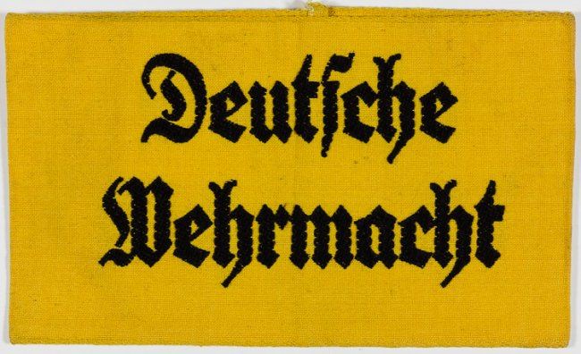 "Deutsche Wehrmacht" armband, 14 1/2" long with BeVo-type embroidered lettering on yellow cotton, 4 1/4" wide, expertly joined on the reverse. Very good.