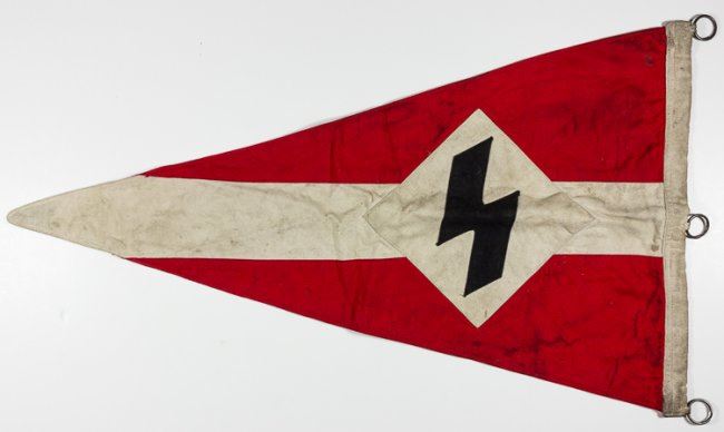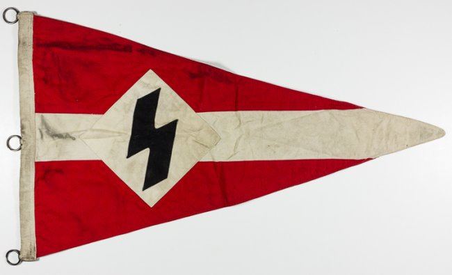 Scarce D.J. pennant, 13" along the hoist, 22" long, well-constructed of separate sections of white, red and black to create a two-sided pennant. Three steel split rings are sewn to the canvas hoist. Soiled, else very good.