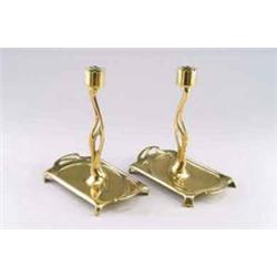 DEUTSCHLAND Paar Leuchter, Messing. Auf vier kleinen Füßchen rechteckiges Tablett mit amorphen Handhaben, deren reliefiertes Dekor auf das Tabett übergeht. In der Mitte ein vegetabil gebogener, teils durchbrochener Schaft, darauf eine zylindrische Tülle mit gewelltem Rand. H.: 18 cm. Bez.: GESCHÜTZT. Um 1910