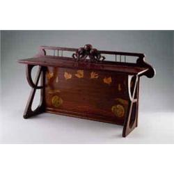 DEUTSCHLAND Wandkonsole, Mahagoni. Rechteckige Fläche mit floralem Intarsiendekor, durchbrochen gearbeitete Seitenteile, darüber ein profiliertes Regal als Ablagefläche, dahinter ein an den Seiten geschwungener, in der Mitte durchbrochen gearbeiteteter Aufsatz mit geschnitzten Früchten und Blättern. 38,5 x 69 x 17 cm. Unbezeichnet. Um 1900