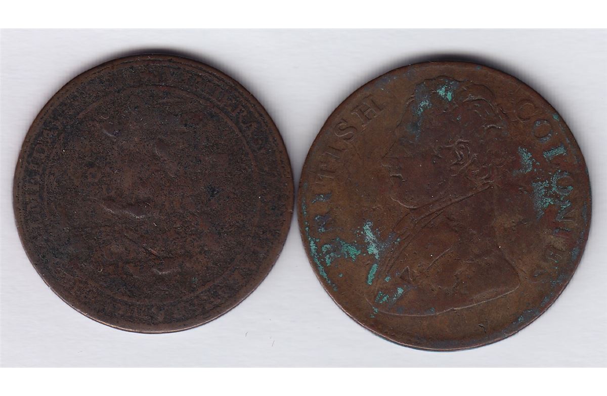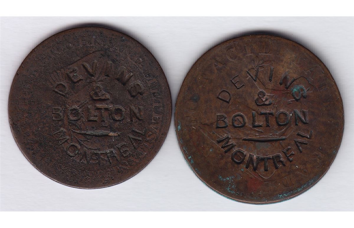 DEVINS & BOLTON MONTREAL Countermarked On obv. of Vimiera Talavera Wellington Halfpenny, BR 987, Unpublished; On rev. of British Colonies Halfpenny, 1825, BR 993, WB-234. Brunk 11510. 2 Pcs.