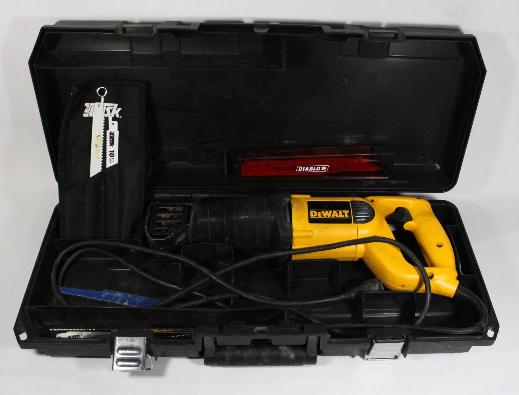 RECIPROCATING SAW IN CASE WITH SOME BLADES. SOME NEW BLADES SOME USED.