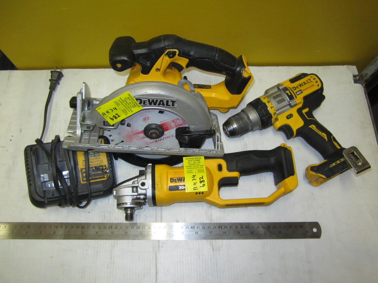 DEWALT CORDLESS TOOLS - ANGLE GRINDER, CIRCULAR SAW, DRILL W/CHARGER - NO BATTERY