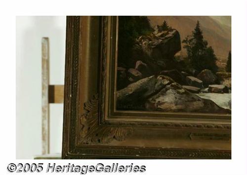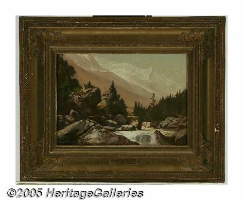 <B>DEWITT CLINTON BOUTELLE (American 1820- 1884)</B></I><BR>Mountain Landscape with Stream, 1882<BR>Oil on panel<BR>10in.x 14in.<BR>Signed and date lower left<BR><BR>Condition Report: Canvas has a beva lining and has been restretched onto modern stretcher, scattered specks of inpaint in the sky and alon edges of canvas, old layer of varnish pooling in areas<BR>