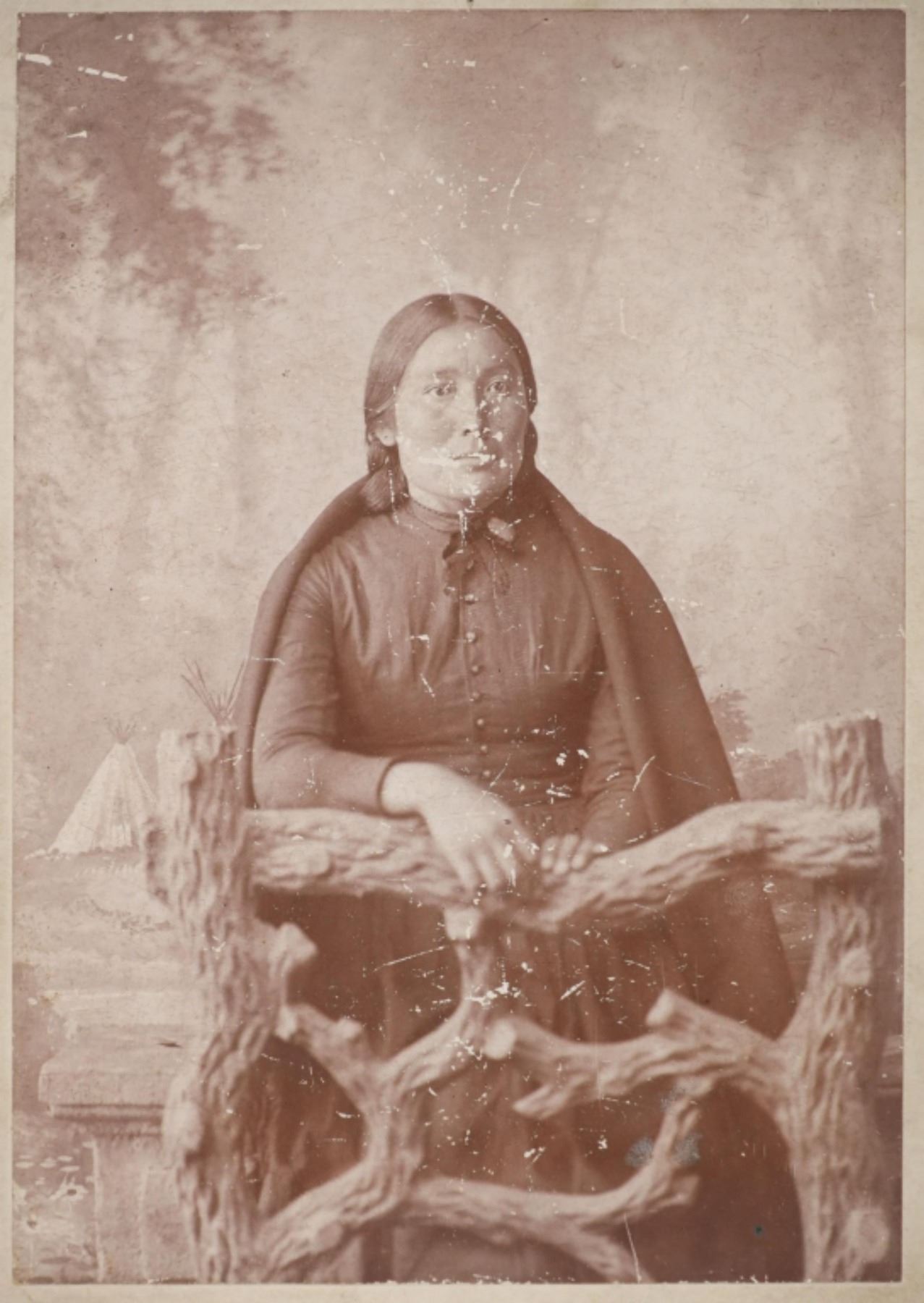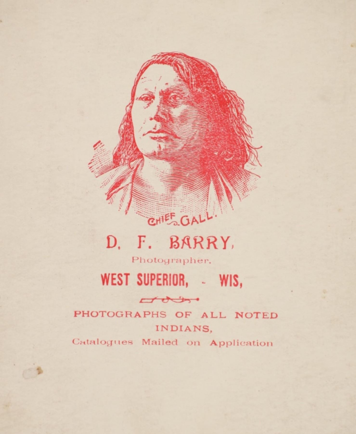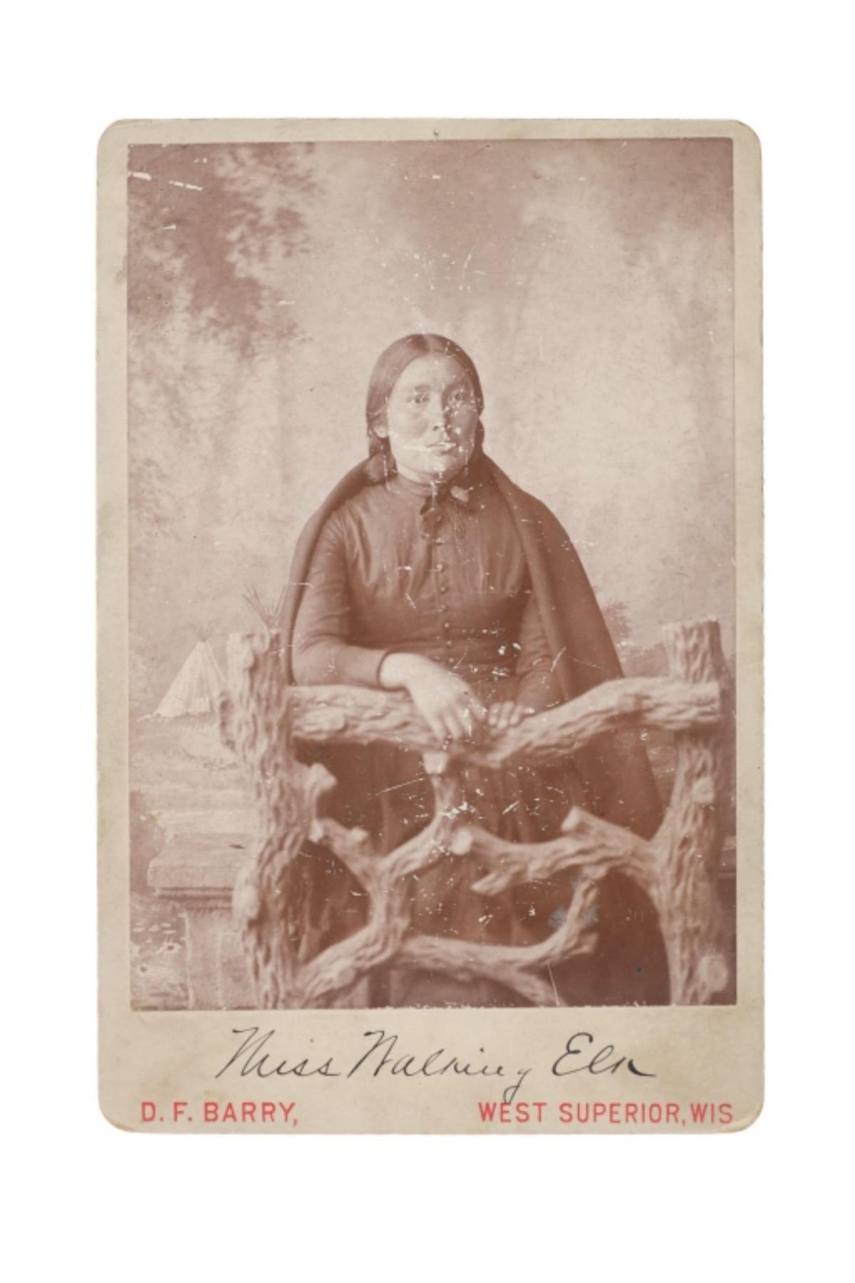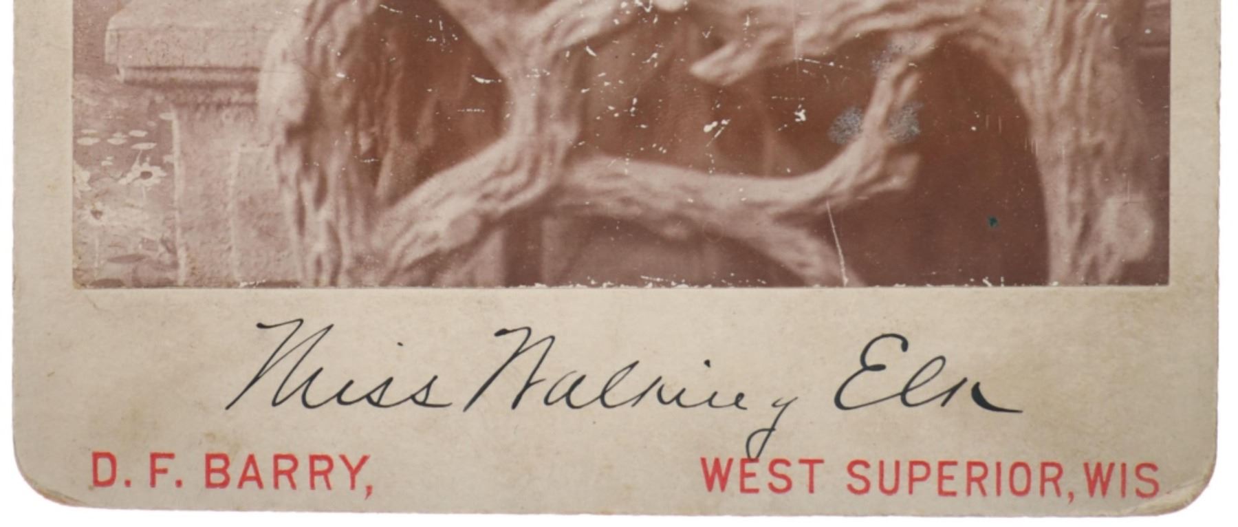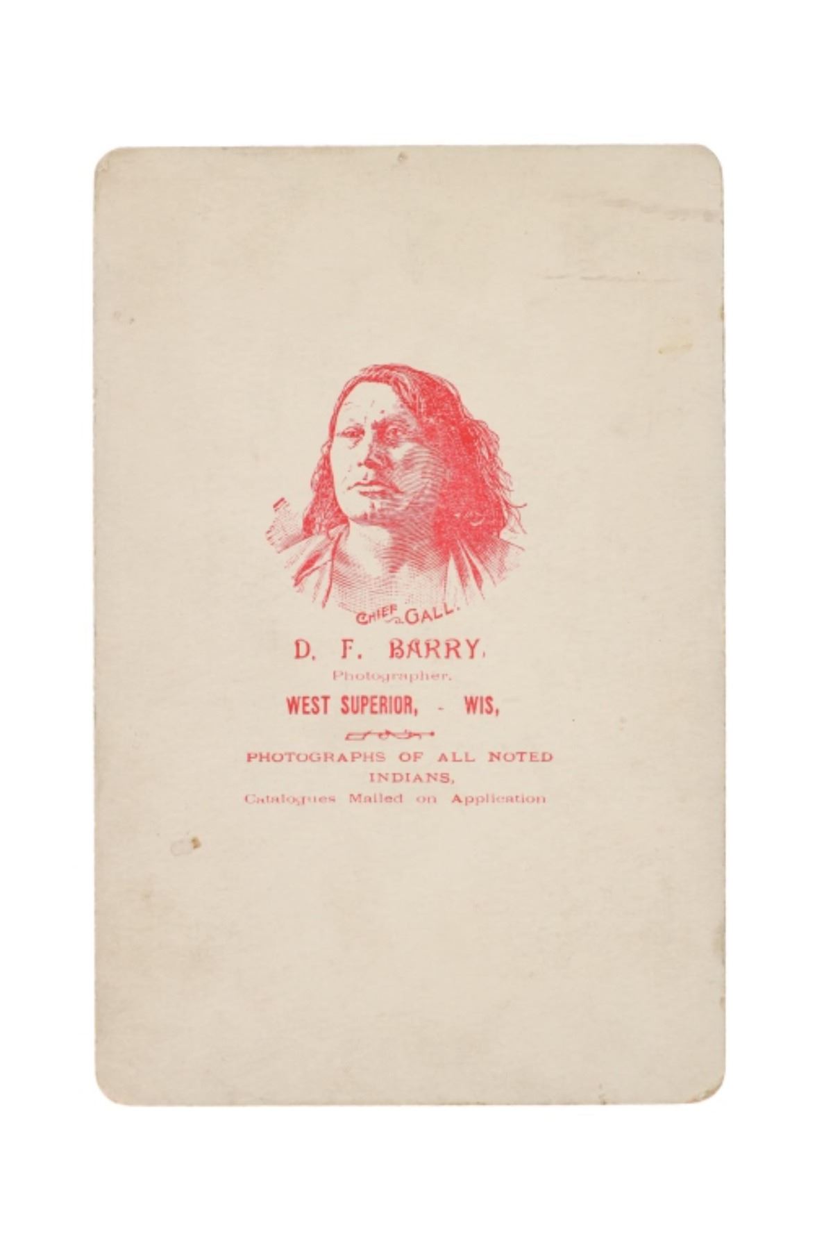 Featured in this lot is this "Miss Walking Elk" cabinet card from American photographer David F. Barry born in 1854 and died in 1934; from the ex-collection of the C.M. Russell Museum and John Kleinschmidt. The cabinet card features a wonderfully and professionally crafted original construction that shows a portrait photograph of Walking Elk. The front of the cabinet card is marked as follows: Miss Walking Elk - D.F. Barry, West Superior, Wis. The back is marked with the company stamp of D.F. Barry and reads as follows: Chief Gall - D.F. Barry, - Photographer, West Superior - Wis. - Photographs of all the noted Indians, - Catalogues Mailed on Application. Provenance: From the John Kleinschmidt collection which was on loan to the C.M. Russell Museum from 1987 to 1993 and included in the "The Cowboy West: 100 Years of Photography 1992-1993 exhibit. The condition of this D.F. Barry cabinet card is preserved with some wear to the front and the back of the cabinet card and shows some wear to the corners but otherwise is in preserved condition. The measurements of this cabinet card is 6 1/2" x 4 1/4". The collective weight of this cabinet card is U4oz.
