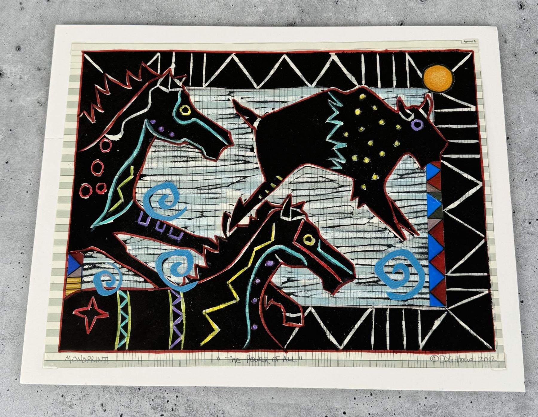 14" by 11" on backing. DG House (Born 1959) is active/lives in Montana, Ohio. DG House is known for Native Americans, wildlife. The artist's website says contemporary Native American Artist DG House is artist in residence in Grand Teton National Park, Yellowstone National Park and the Eiteljorg Museum of American Indians and Western Art in Indianapolis, IN. Her work has exhibited in the finest Art Museums including the Holter Museum of Art, the Missoula Museum of Art, the Yellowstone Art Museum and the CM Russell Museum in Montana as well the Phippen Museum of Art in Prescott, AZ, the Heard Museum in Phoenix, AZ, the Eiteljorg Museum of Indians and Western Art in Indianapolis, IN, the John Clymer Museum in Ellensburg, WA, the Western Art Museum in Kerrville, Texas and the Indian Market at the Autry National Center in Los Angeles, CA. In 2020, DG House participates in the invitational Cowgirl UP! Exhibition at the Desert Caballeros Western Museum in Wickenburg, AZ.