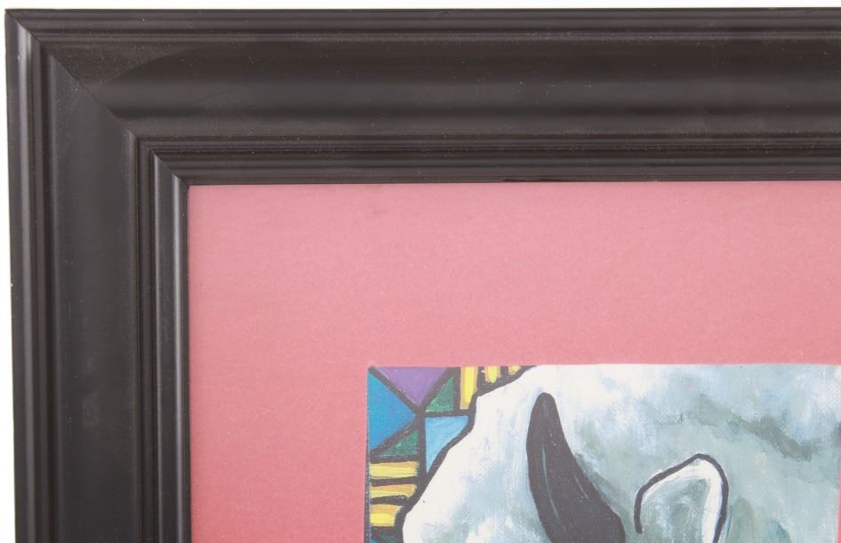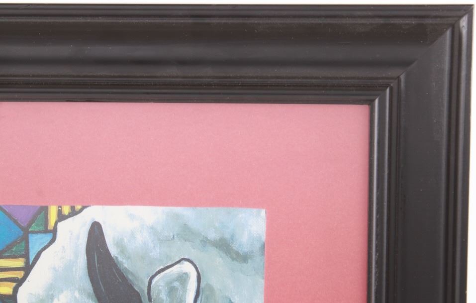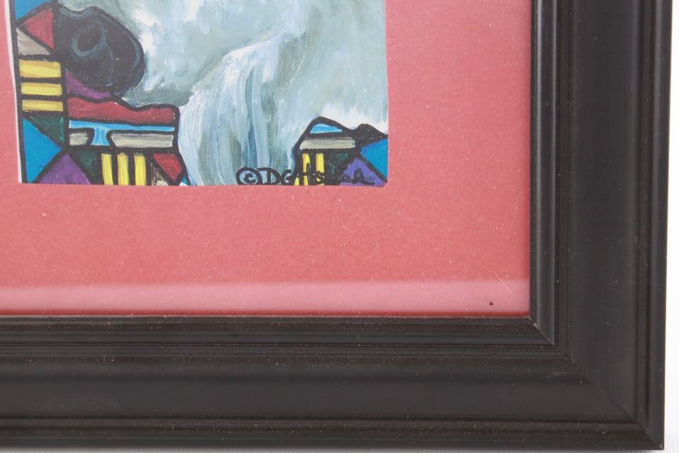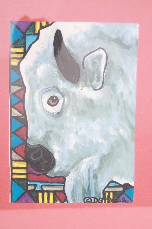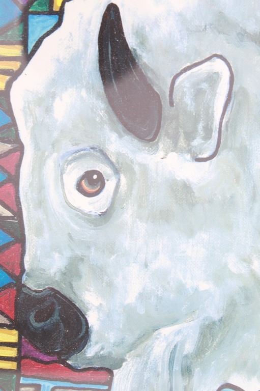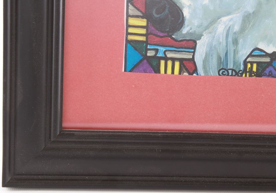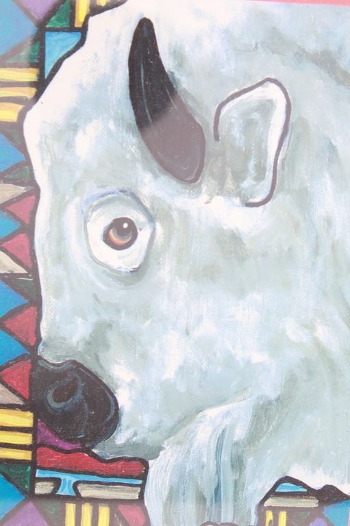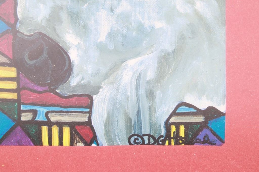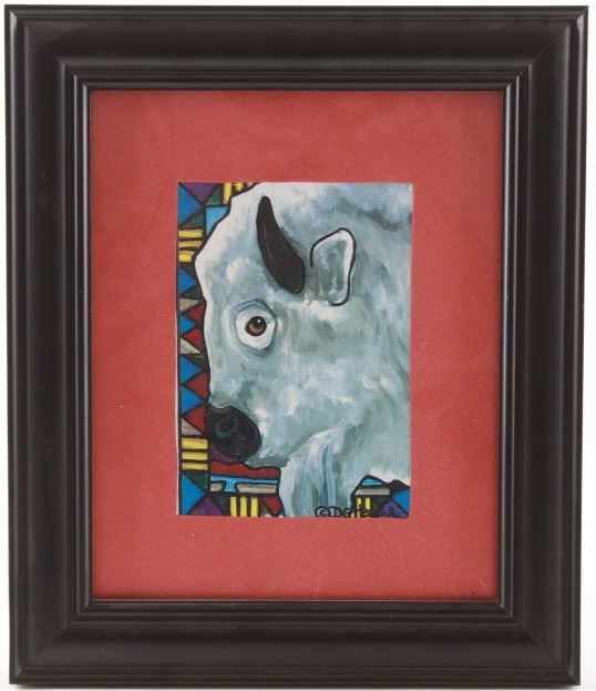 Featured in this lot is this framed giclée called "White Buffalo," by Montana artist DG House. The artwork shows wonderfully and professionally crafted giclée construction that shows a white buffalo with a geometrically decorated background. The artist signature can be seen in the bottom right hand corner. DG House is a popular contemporary Native. American artist being a member of the Cherokee Tribe of NE Alabama and lives in Bozeman, Montana along the Gallatin River. The condition of this framed giclée is good with no obvious signs of damage and in good overall condition. The measurements of this framed giclée are 13" x 11" and the visible art measures 6 1/2" x 4 1/2".