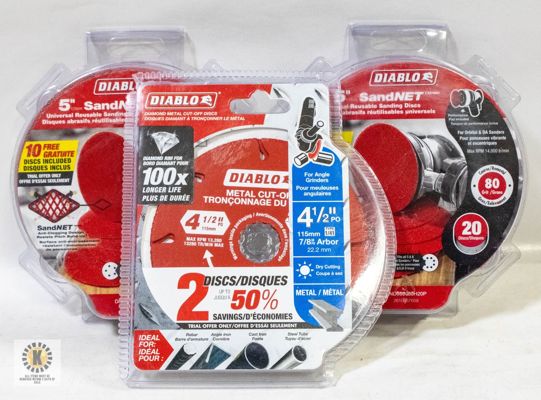 SAND PAPER & DIAMOND METAL 2-PACK CUT OFF DISC'S 4 1/2" DISCS **ALL ITEMS MUST BE REMOVED BY 5PM SATURDAY, APRIL 26TH 2025. ALL REMAINING ITEMS WILL BE SUBJECT TO A $6.00 PER DAY STORAGE CHARGE. ANY ITEMS REMAINING AFTER MONDAY, MAY 12TH 2025 WILL BE CONSIDERED FORFEITED. NO REFUNDS WILL BE ISSUED FOR FORFEITED ITEMS. TO SCHEDULE A PICK UP APPOINTMENT CLICK HERE