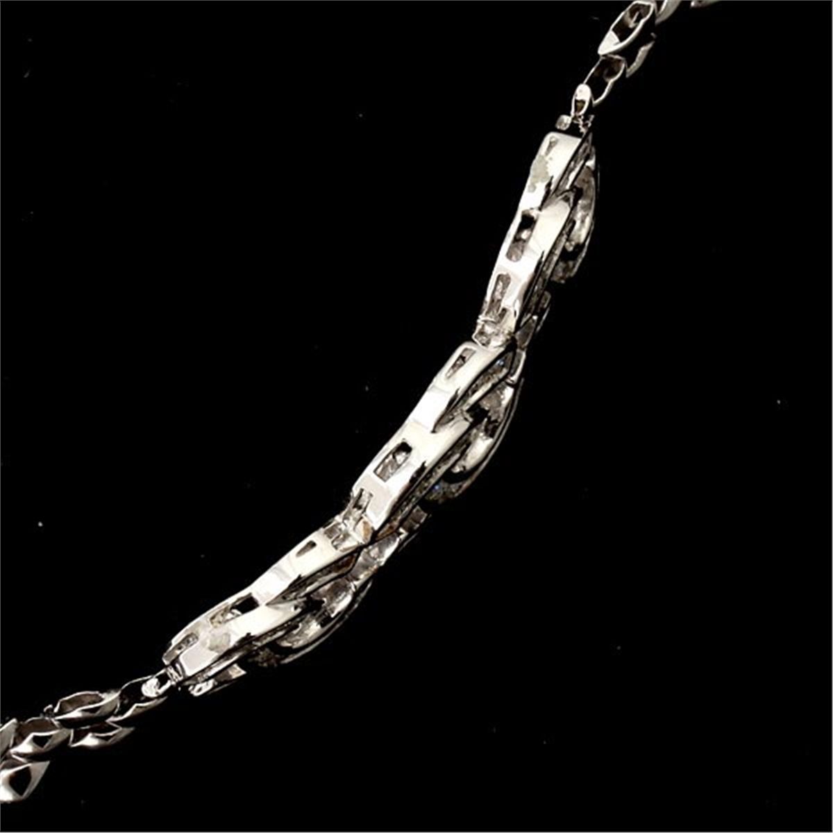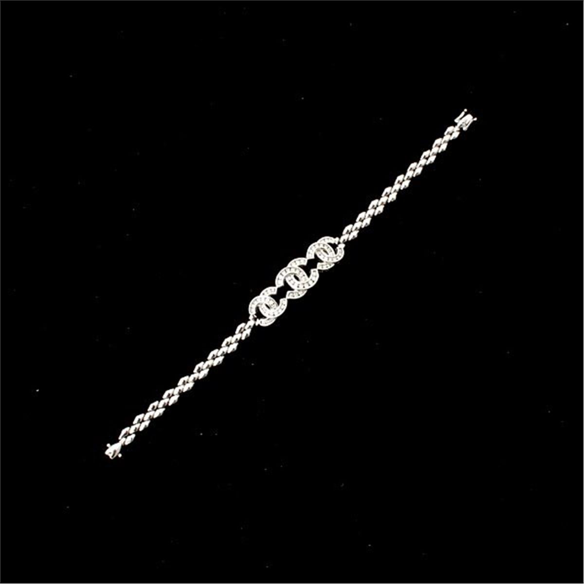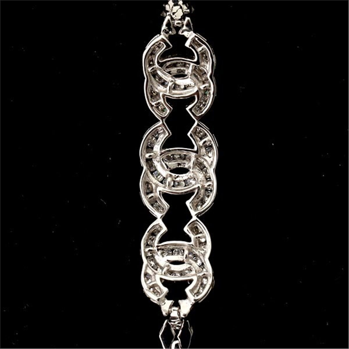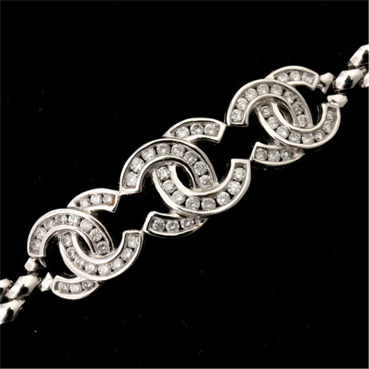 DIAMOND, 14K WHITE GOLD BRACELET. Featuring seventy-five full-cut diamonds weighing a total of approximately 1.50 ct., channel set in three sets of interlocking, opposing "C"s attached to a 14k white gold linked bracelet completed by a tongue and groove clasp forming a 6 1/2 inch bracelet. 5.40 dwts
