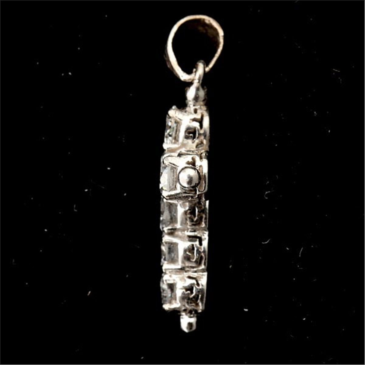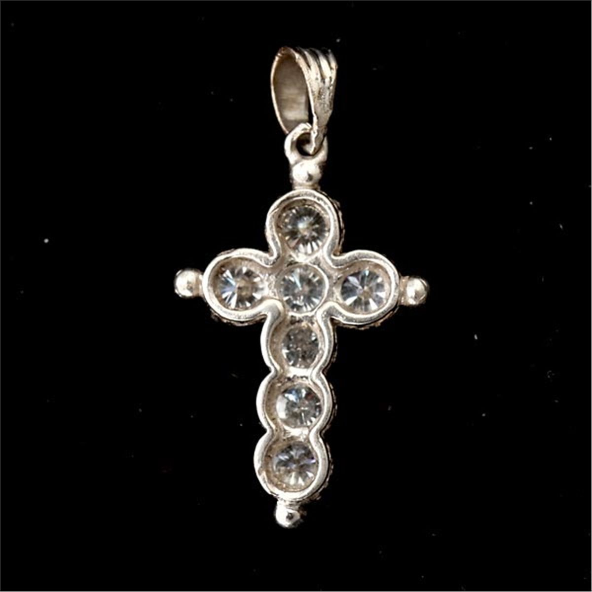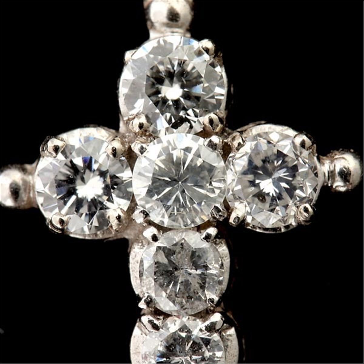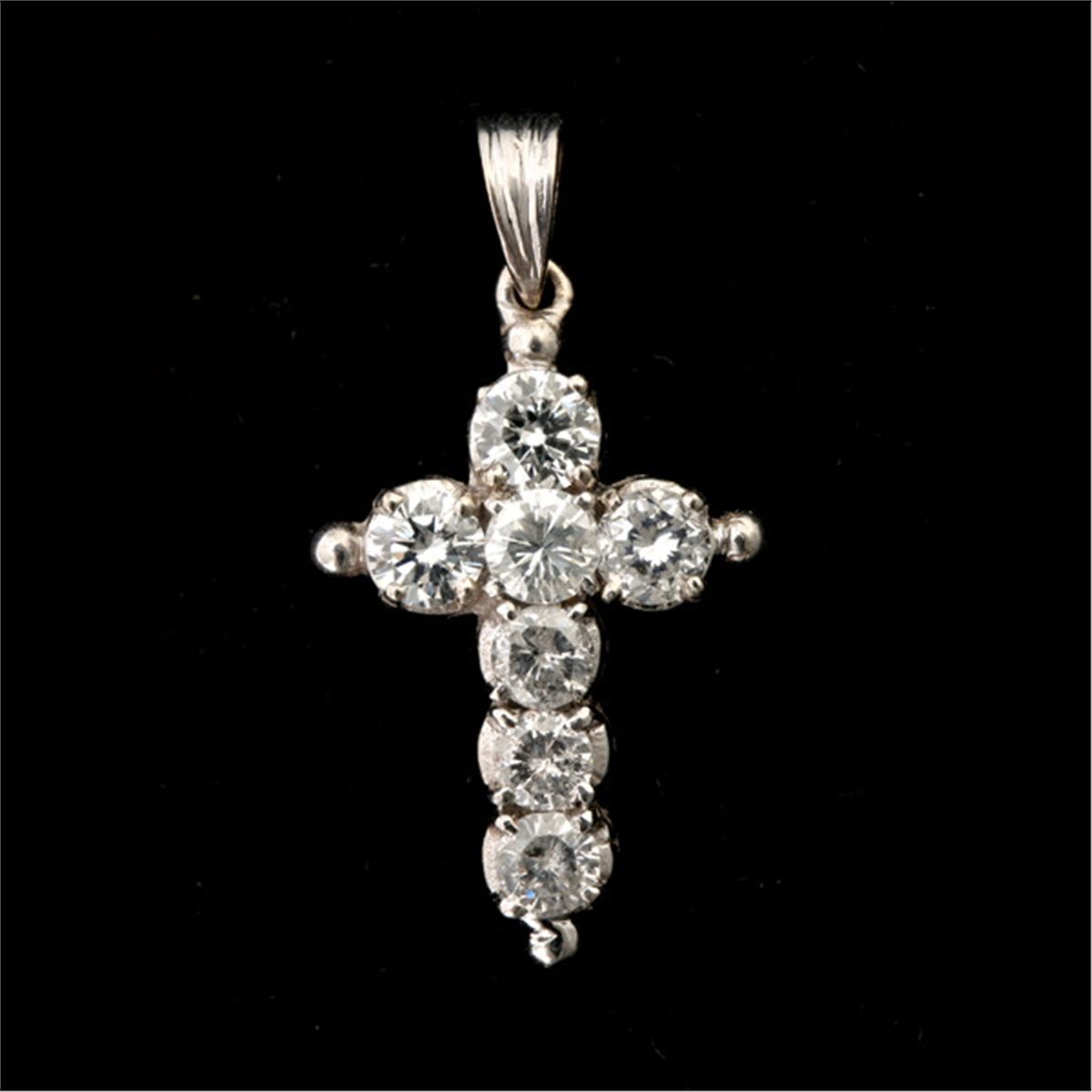 DIAMOND, 14K WHITE GOLD CROSS PENDANT. Featuring seven full-cut diamonds weighing a total of approximately 1.25 ct., prong set in 14k white gold. 1.50 dwts