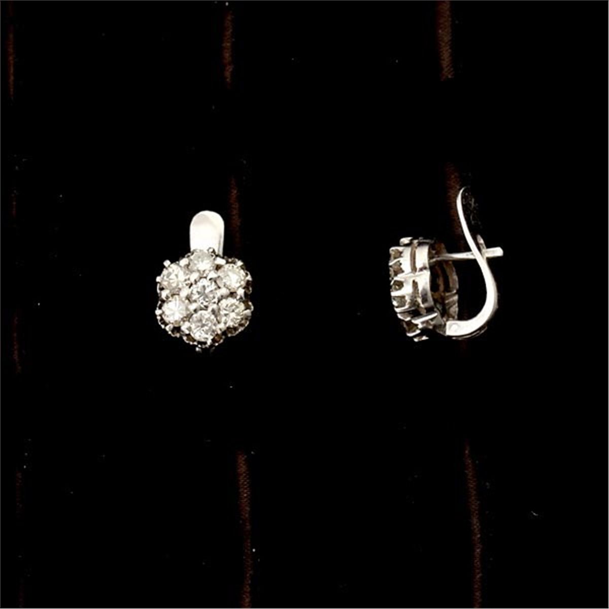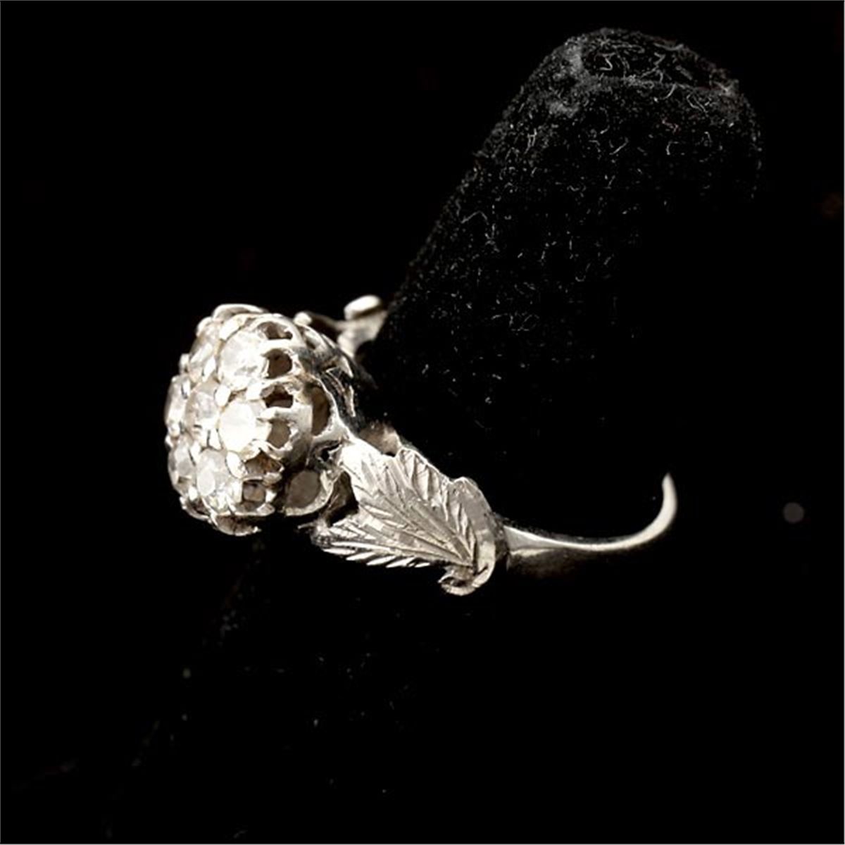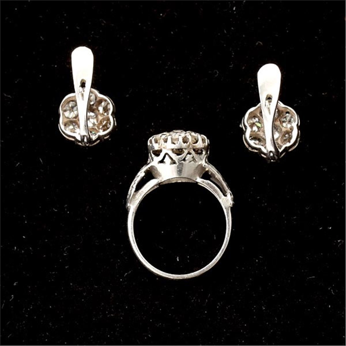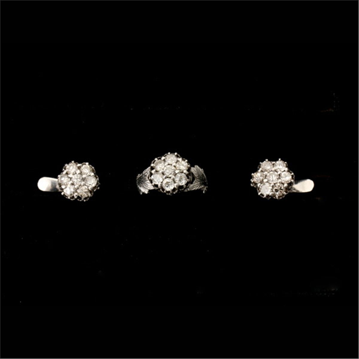 DIAMOND, 14K WHITE GOLD JEWELRY SUITE. Including a ring featuring seven old European-cut diamonds weighing a total of approximately 0.75 ct., ring size 6; together with a pair of earrings featuring fourteen old European-cut diamonds weighing a total of approximately 1.50 ct. Prong set in 14k white gold. The suite weighs 4.80 dwts.