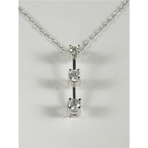 PENDANT WITH CHAIN: Delicate 14k white gold pendant with chain set with three round cut diamonds. The diamonds measure approximately 0.25 ctw, have I2 clarity and H color. Appraisal included.