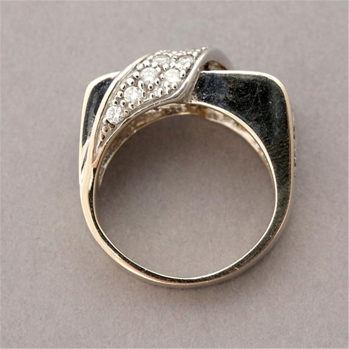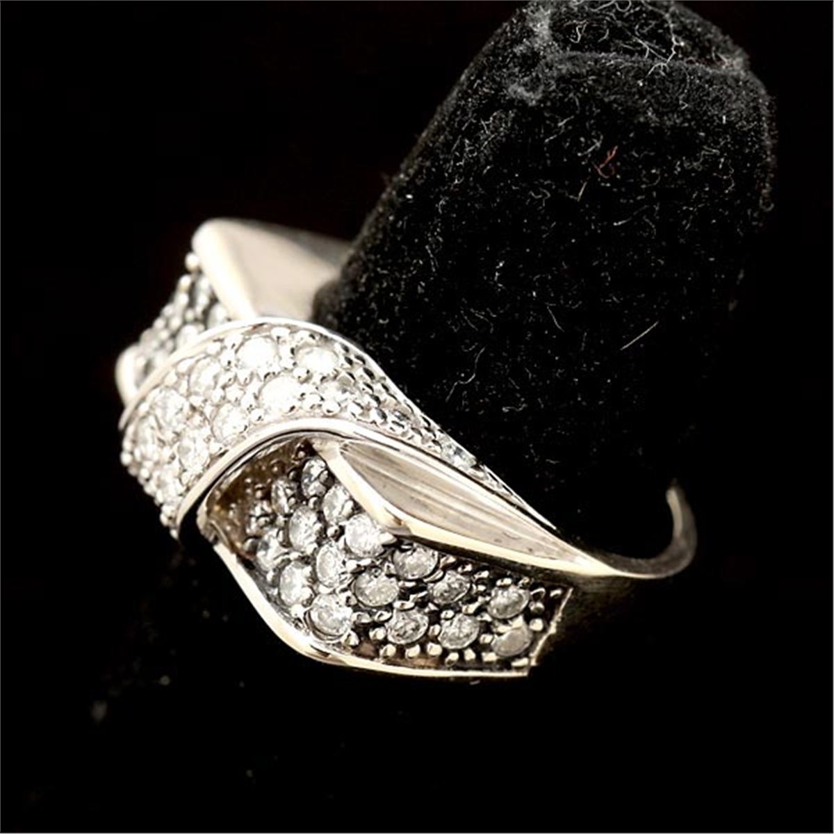 DIAMOND, 14K WHITE GOLD RING. Featuring fifty-two full-cut diamonds weighing a total of approximately 1.00 ct., bead set in a 14k yellow gold mounting. Size 5 1/2, 5.90 dwts