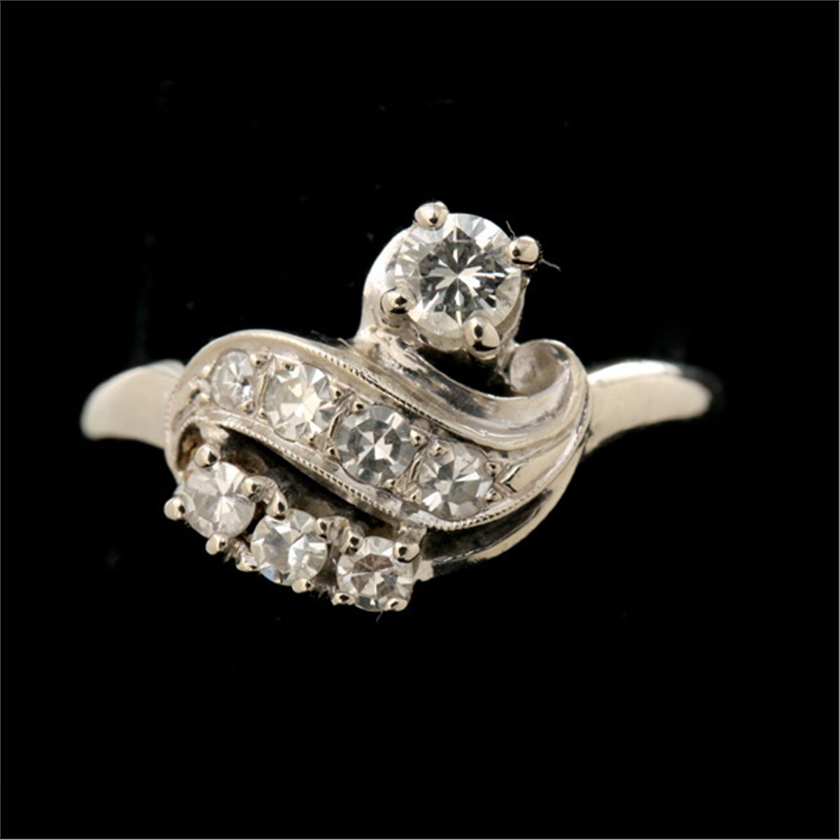DIAMOND, 14K WHITE GOLD RING. Featuring eight round-cut diamonds weighing a total of approximately 0.35 ct., prong and bead set in a 14k white gold mounting. 2.30 dwts