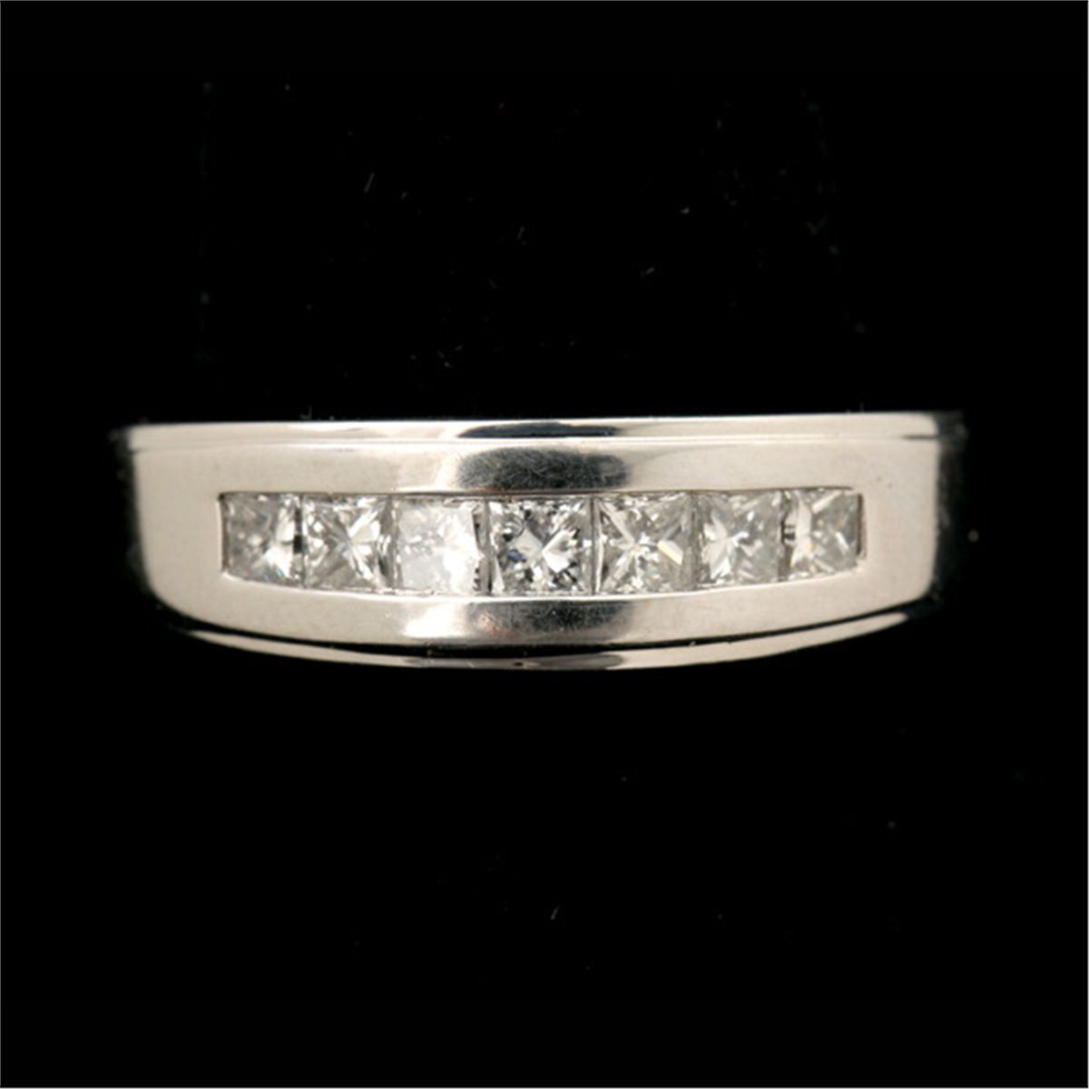 DIAMOND, 14K WHITE GOLD RING. Featuring seven princess-cut diamonds weighing a total of approximately 0.85 ct., channel set in a 14k white gold mounting. Size 11 1/2, 5.50 dwts