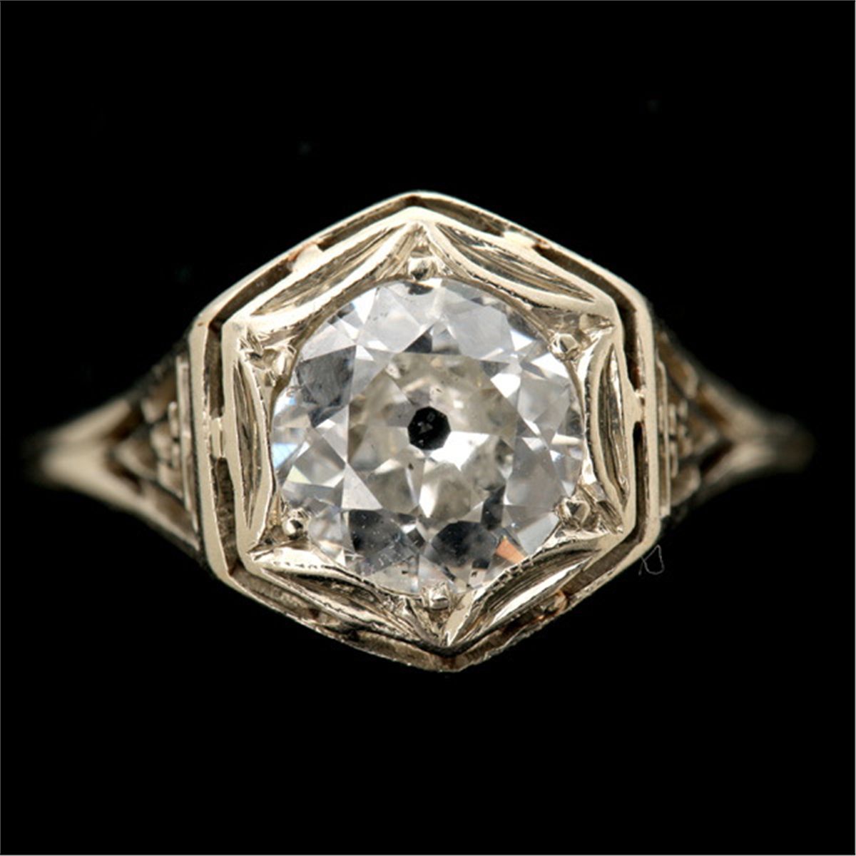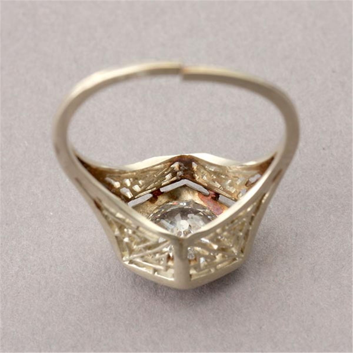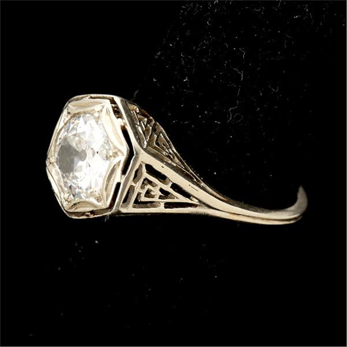 DIAMOND, 14K WHITE GOLD RING. Centering one old European-cut diamond weighing approximately 1.20 ct., bead set in a pierced 14k white gold ring. Size 5 3/4 Note: Shank needs soldering.