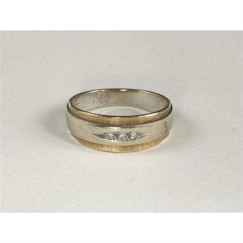 MAN'S RING: Handsome man's 14k white and yellow gold man's ring set with three round cut diamonds. No appraisal is included with this lot.