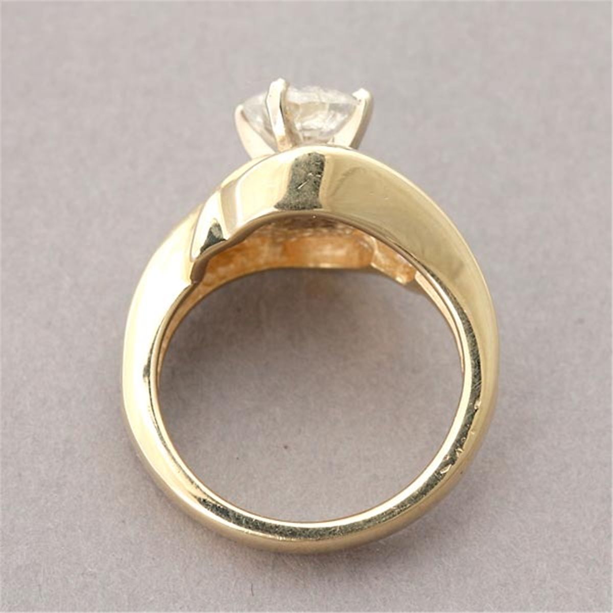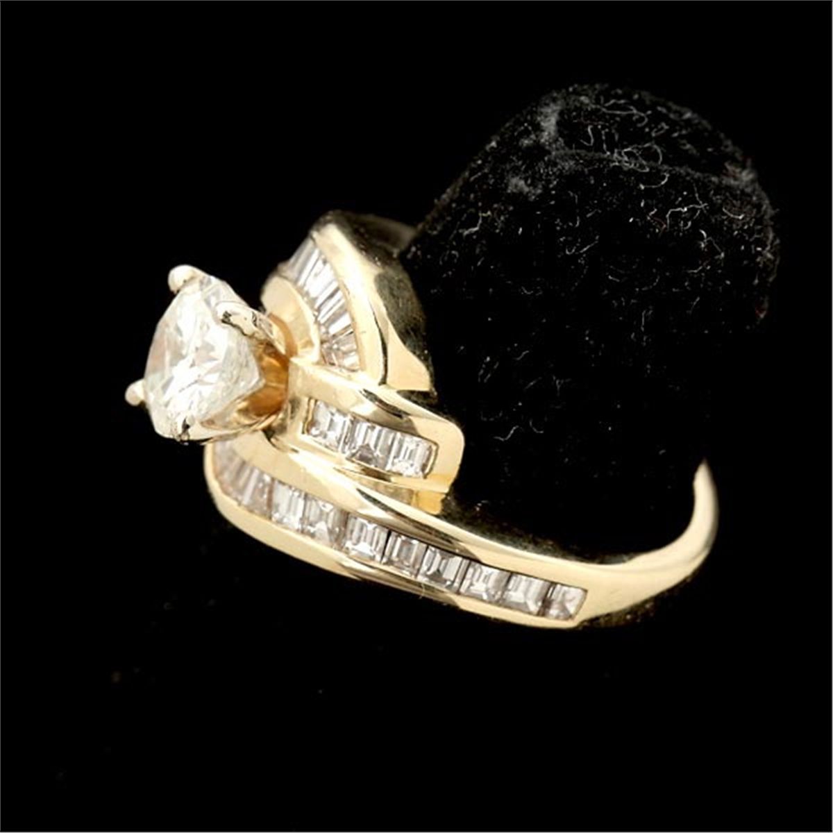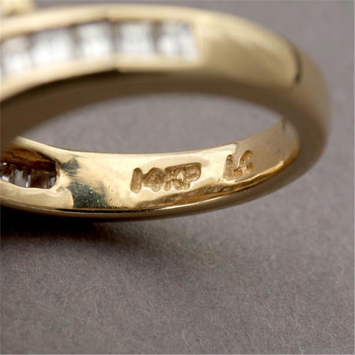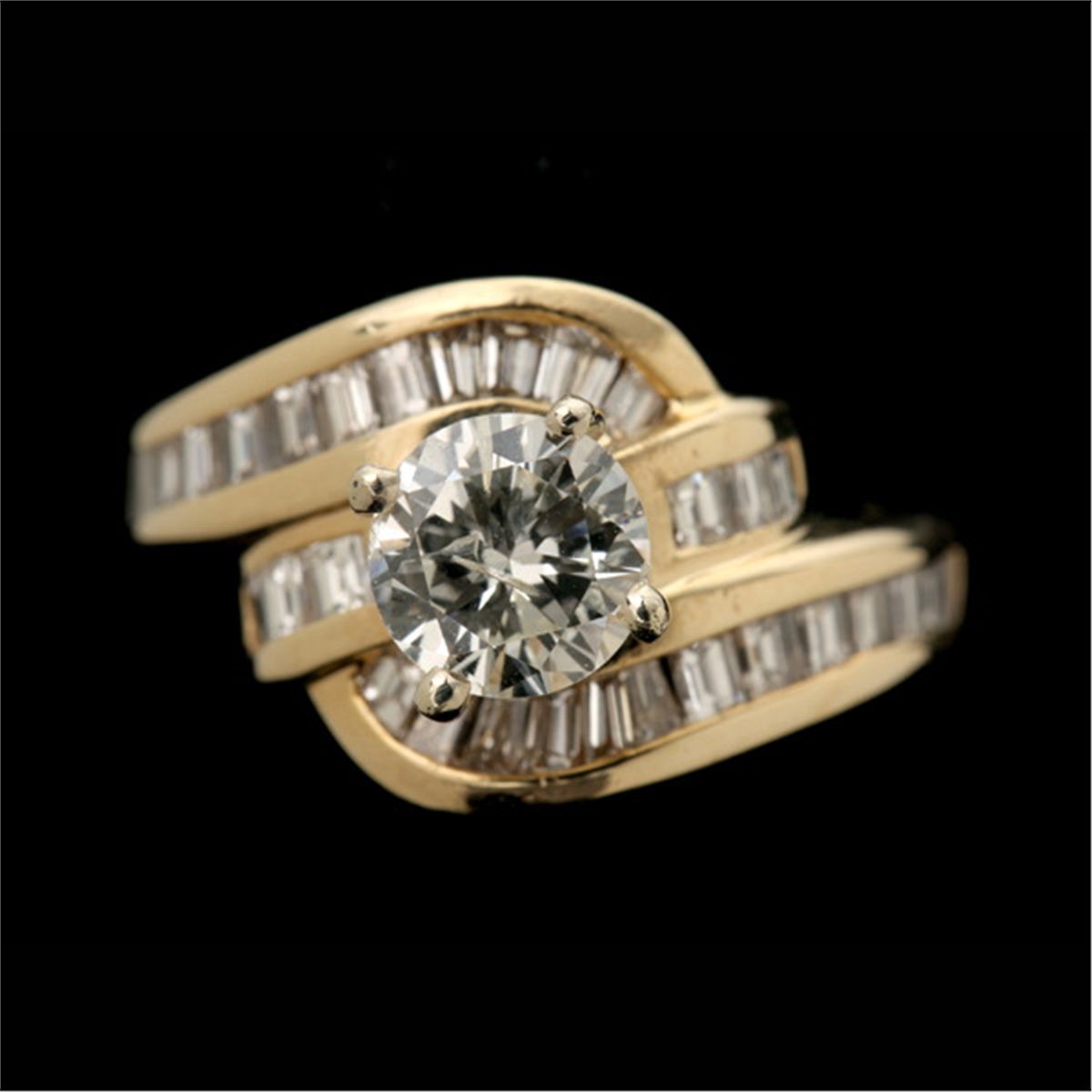 DIAMOND, 14K YELLOW GOLD RING. Centering one round brilliant-cut diamond weighing approximately 0.75 ct., prong and channel set in a 14k yellow gold mounting. Size 3 3/4, 3.80 dwts