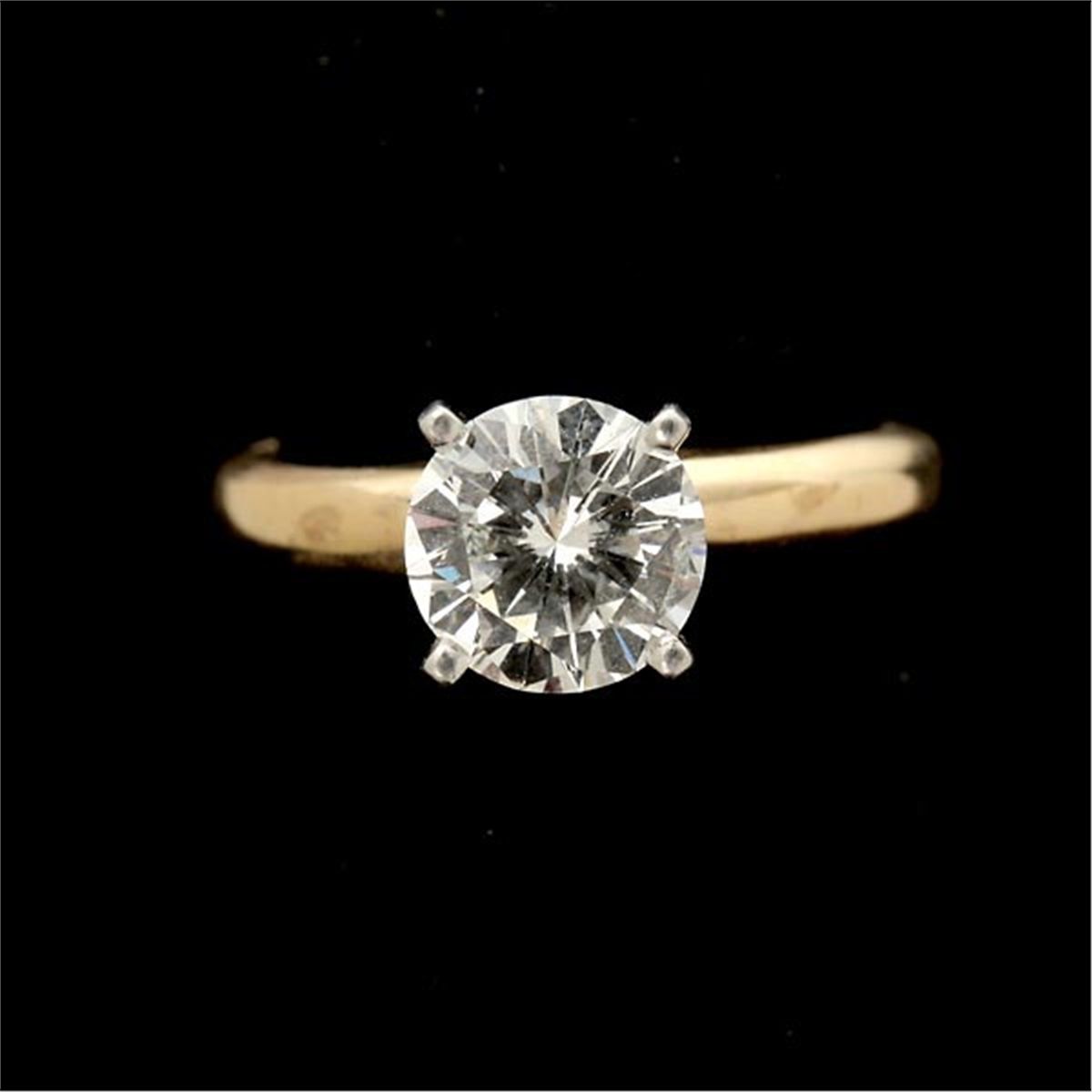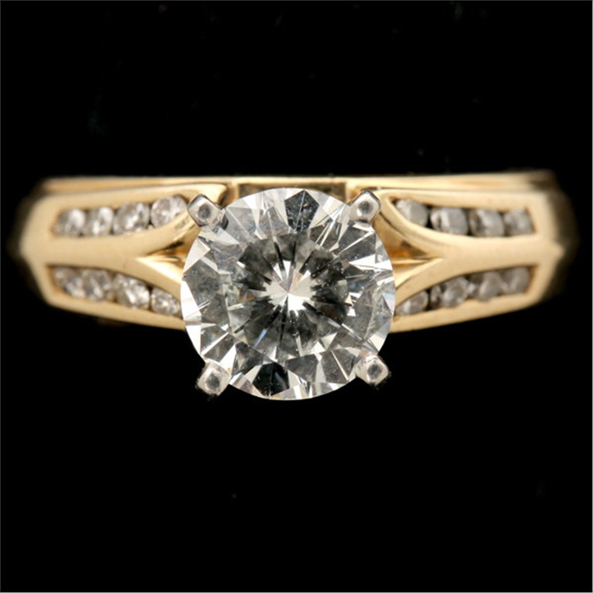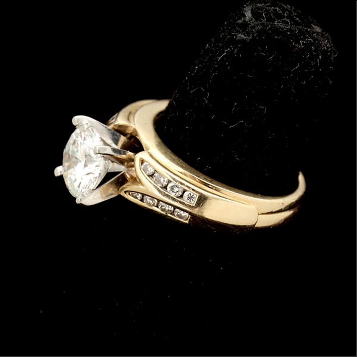 DIAMOND, 14K YELLOW GOLD WEDDING RING SET. Featuring one round brilliant-cut diamond, weighing approximately 1.45 ct., prong set in a 14k yellow gold solitaire mounting, accented by sixteen full-cut diamonds weighing a total of approximately 0.25 ct., prong and channel set in a 14k yellow gold interlocking band. Size 4 1/2, 4.20 dwts