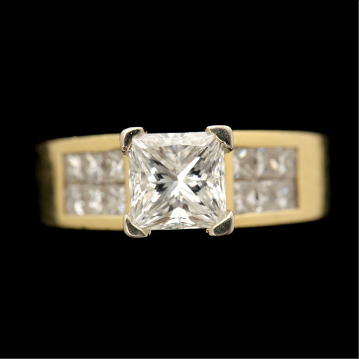 DIAMOND, 18K YELLOW GOLD RING. Centering one princess-cut diamond weighing approximately 2.00 cts., flanked by twelve princess-cut diamonds weighing a total of approximately 1.00 ct., prong and channel set in an 18k yellow gold mounting. Size 6, 6.20 dwts